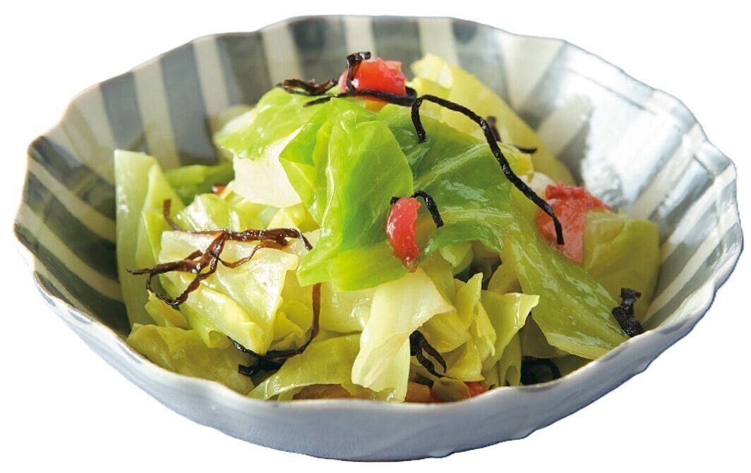 キャベツは一口大に切る。耐熱ボウルに入れてふんわりとラップを掛け、電子レンジで約4分加熱する。粗熱を取って軽く絞るようにして余分な水けをきる。梅干し、塩昆布、ごま油とあえる。(市瀬)