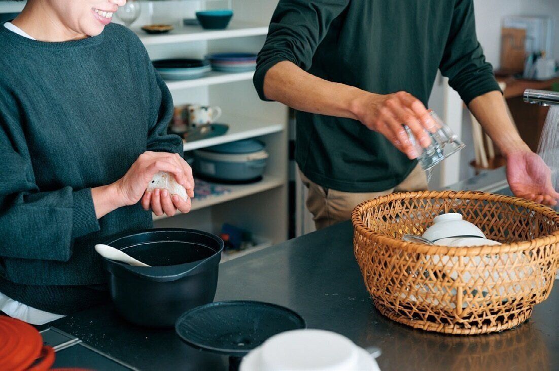 「相手が何かやっていたら自分も一緒にやり、早く終わらせて2人でゆっくりする」がはなさんと夫の基本スタンス。だから、夕食後は夫が食器を片づけ、はなさんは翌朝用のおにぎりを握って家事を同時進行で片づけます。