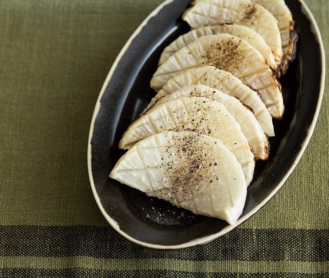 大根は皮をむいて厚さ1cmの半月切りにし、片面に格子状に切り込みを入れる。[A]をからめて魚焼きグリル(またはオーブントースター)で8~10分焼く。器に盛り、黒こしょうをふる。