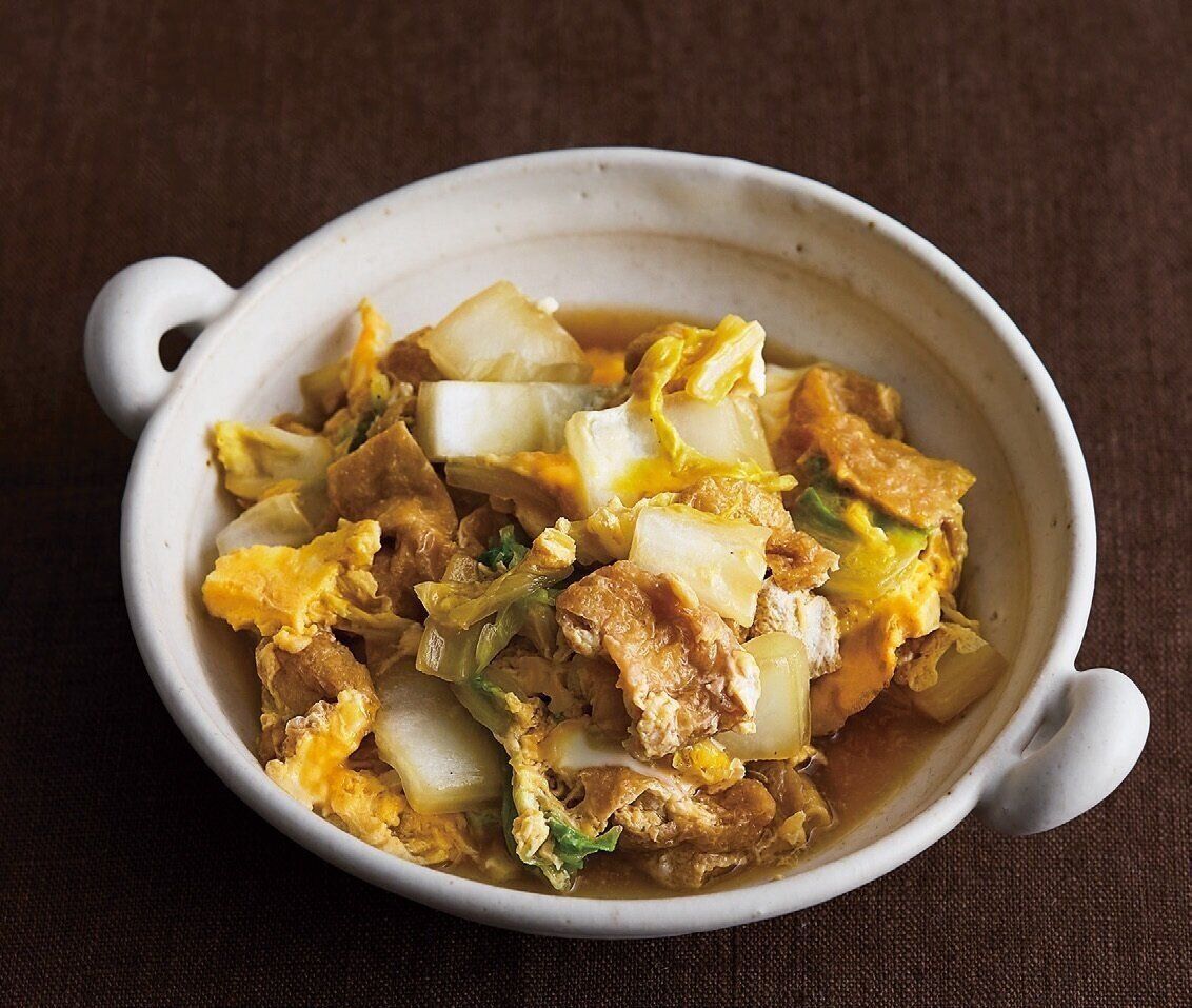 白菜は縦半分に切り、横に幅2cmに切る。油揚げは半分に切って幅2cmに切る。フライパンに水200ml、めんつゆ、白菜、油揚げを入れて火にかけ、ふたをして中火で約5分煮る。卵を溶きほぐして回し入れ、ふたをして弱火で約1分煮る。
