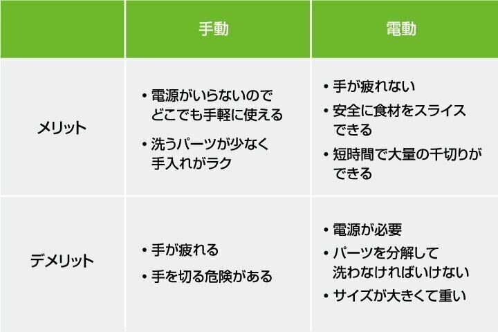 キャベツの千切りスライサーは、手動と電動でそれぞれ特徴があります。ここでは異なる2種類のメリット・デメリットについて解説します。