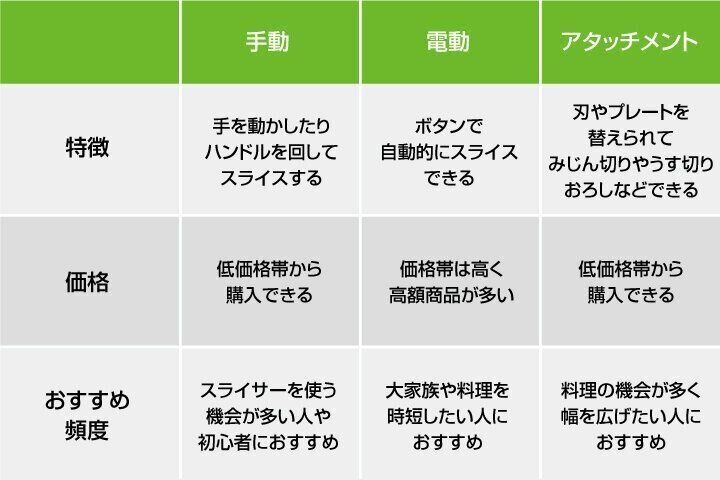 電動式は、食材をセットしたらボタンを押すだけで千切りがつくれるので、手動よりもお手軽です。大家族や時短したい人に向いています。ですが、電動式は商品が大きく価格帯も高いので、収納場所や使う頻度を考えておくといいでしょう。
