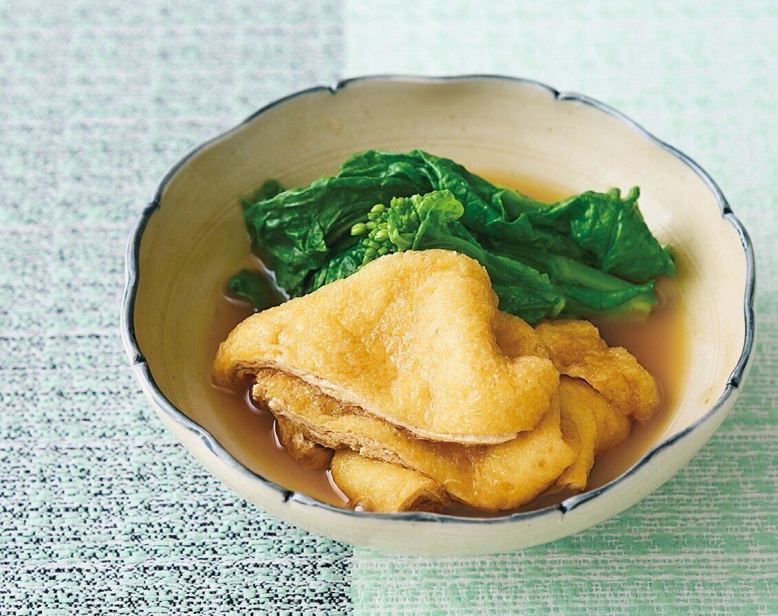 油揚げは熱湯を回しかけて油抜きし、三角形に四等分に切る。菜の花は半分の長さに切り、茎と葉を分けておく。鍋に[A]、油揚げを入れてひと煮立ちさせ、菜の花の茎を入れ、ふたをして中火で3分煮て、葉を加えてさらに1分30秒煮る。