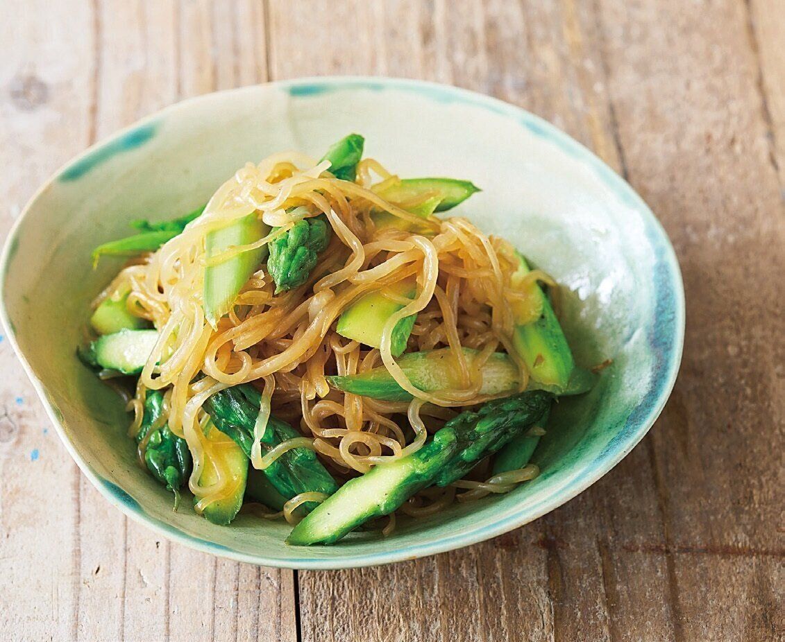 しらたきは沸騰した湯で約2分ゆでて食べやすい長さに切る。アスパラガスは根元の硬い部分の皮をむき、幅1cmの斜め切りにする。フライパンにごま油、しらたきを入れて中火にかけて炒める。パチパチと音が鳴って全体に油がなじんだらアスパラガスを加え、炒め合わせる。[A]を加え、汁けがなくなるまで炒める。