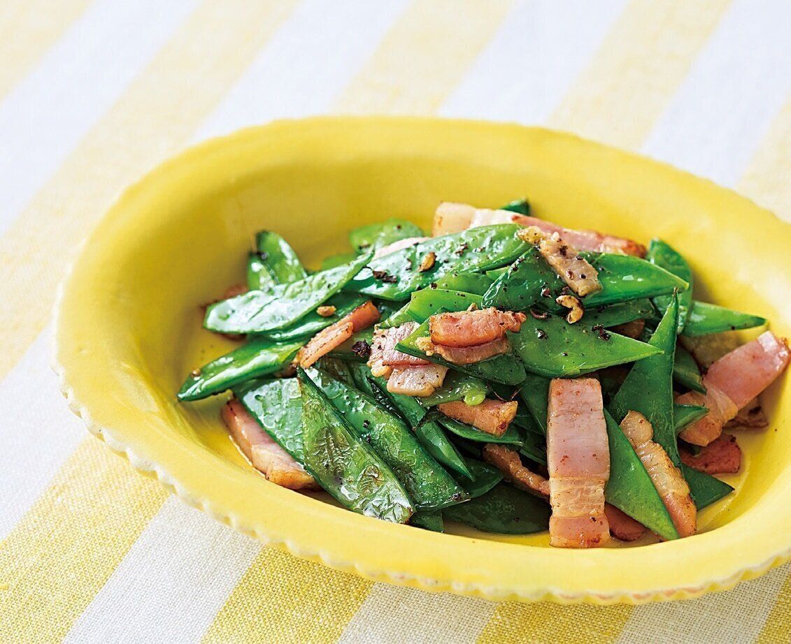 きぬさやは筋を除き、斜めに半分に切る。ベーコンは幅1cmに切る。フライパンにバターとオリーブ油を入れて中火にかけ、バターが溶けたらきぬさやとベーコンを入れて炒める。きぬさやが色鮮やかになったら塩小さじ1/3を加えてさっと炒め合わせる。器に盛り、黒こしょう少々をふる。