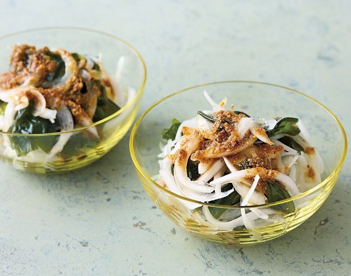 わかめはたっぷりの水でもどし、沸騰した湯に入れてさっとゆでる。湯をきって食べやすい長さに切る。玉ねぎは薄切りにし、さっと水にさらし、水けを拭く。わかめと玉ねぎを混ぜて器に盛り、[A]をかける。