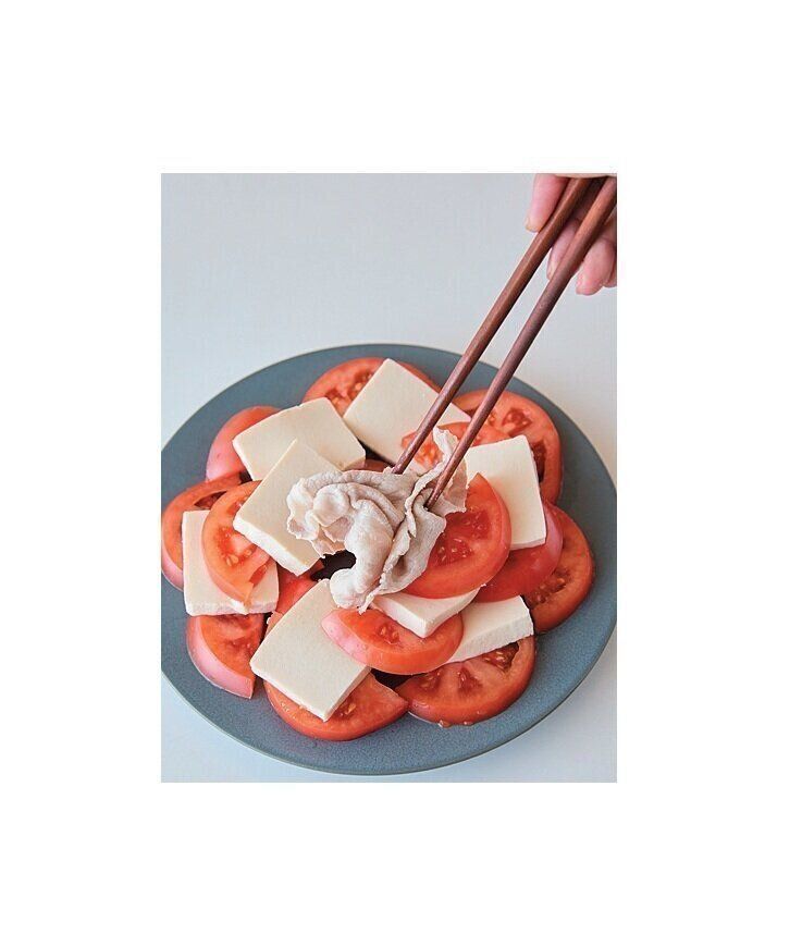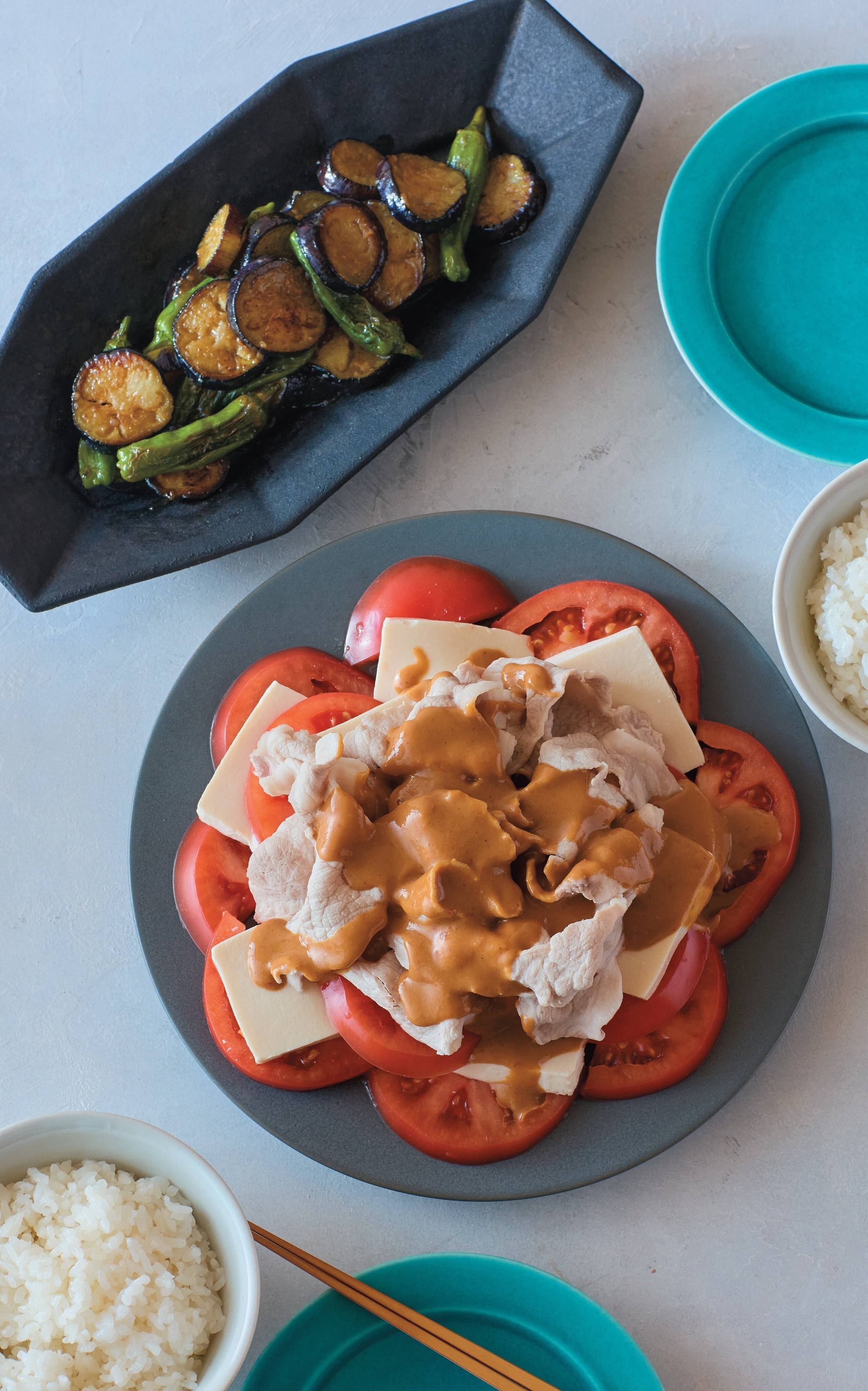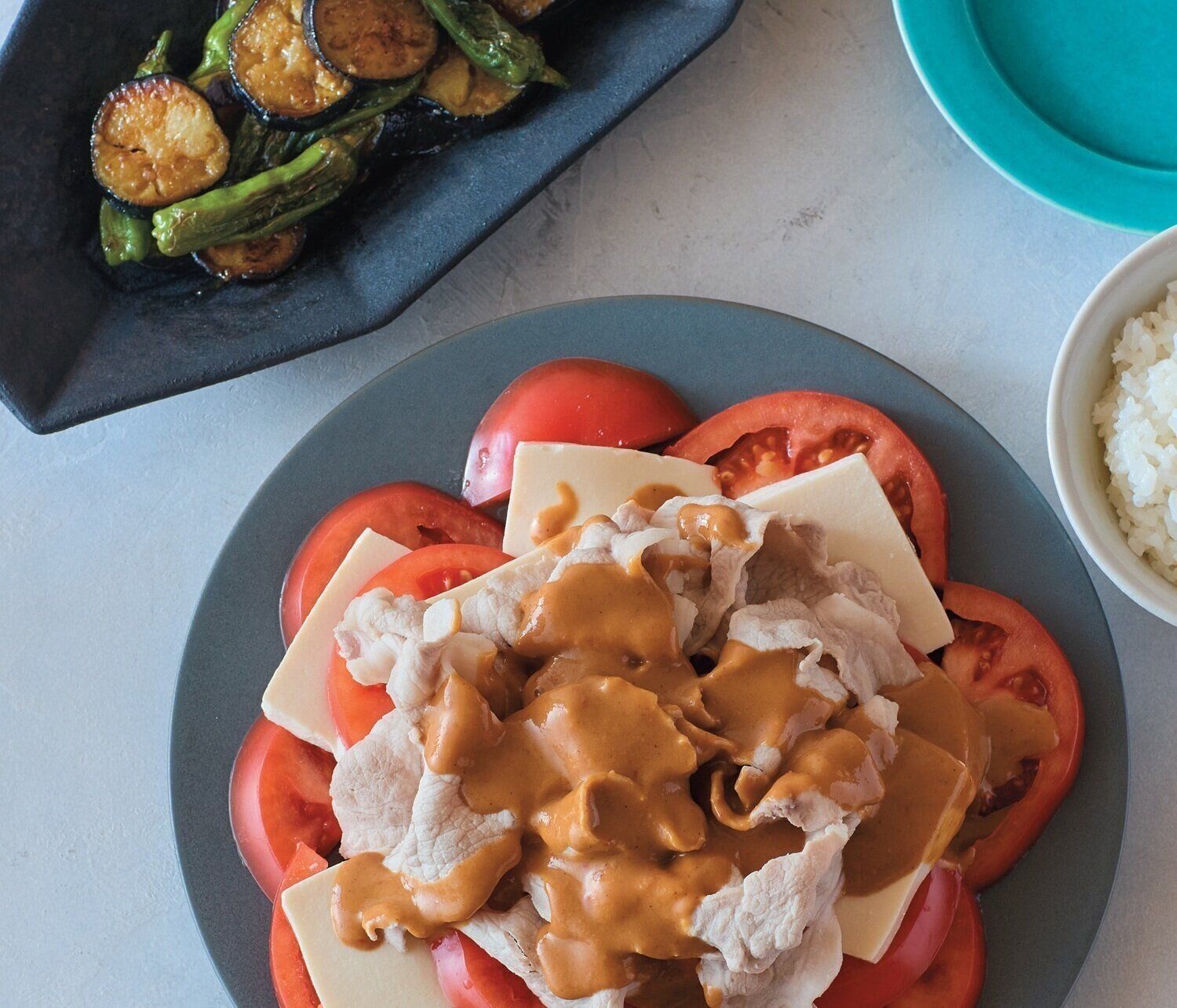 【市瀬さん】忙しい日は切らずに使えて火が早く通るしゃぶしゃぶ用肉を使うのがおすすめ。今日のメインは豚しゃぶのおかずです。トマトと豆腐を盛り合わせる、あっさりしたおかずなので、もう一品は、しっかり味のなすのみそ炒めにしました。