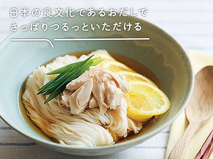 5. 器にそうめん、鶏肉、万能ねぎ、レモンをのせ、1のだし汁を注ぐ。