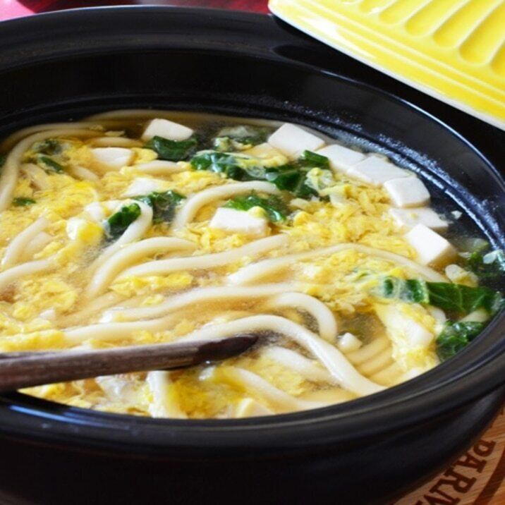 卵、豆腐、白菜を具材に使った、とろみがあって食べやすいあんかけうどんです。味付けはめんつゆとみりんだけでOK。それらを水と一緒に鍋で煮立て、うどん、白菜、豆腐の順に煮ていきます。そのあとに、片栗粉で汁にとろみを付けてから溶き卵を加えることで、ふんわりとした仕上がりにすることができます。