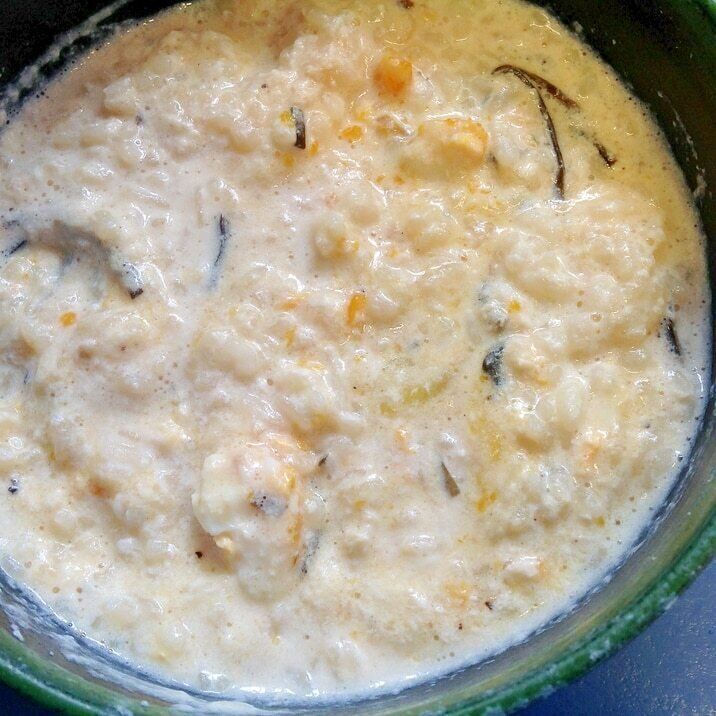 煮込む水分は牛乳のみを使用し、そこへ塩昆布、卵、溶けるチーズを加えて温めていきます。卵については、電子レンジの加熱の際に破裂すると危ないので、安全のために必ず崩してから加熱するようにしてくださいね。