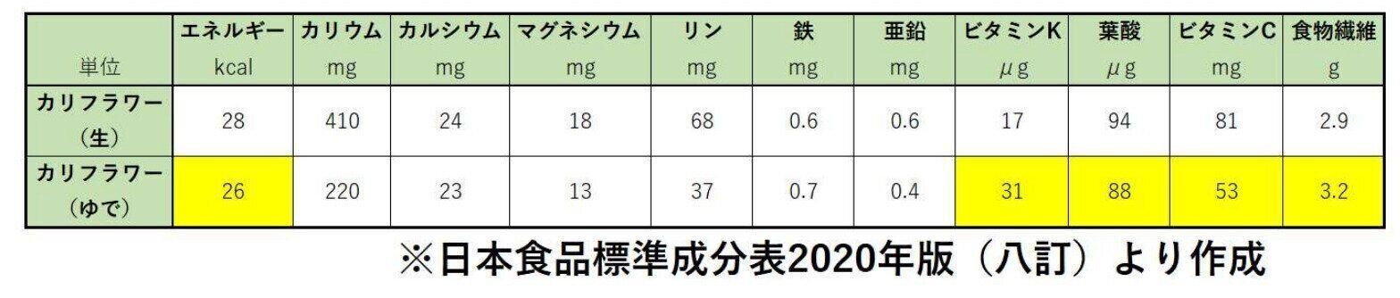 ビタミンCや葉酸などの水溶性ビタミンは、一般的に水や熱に弱い性質をもっています。しかし、カリフラワーに含まれるビタミンCや葉酸は加熱しても壊れにくくなっています。