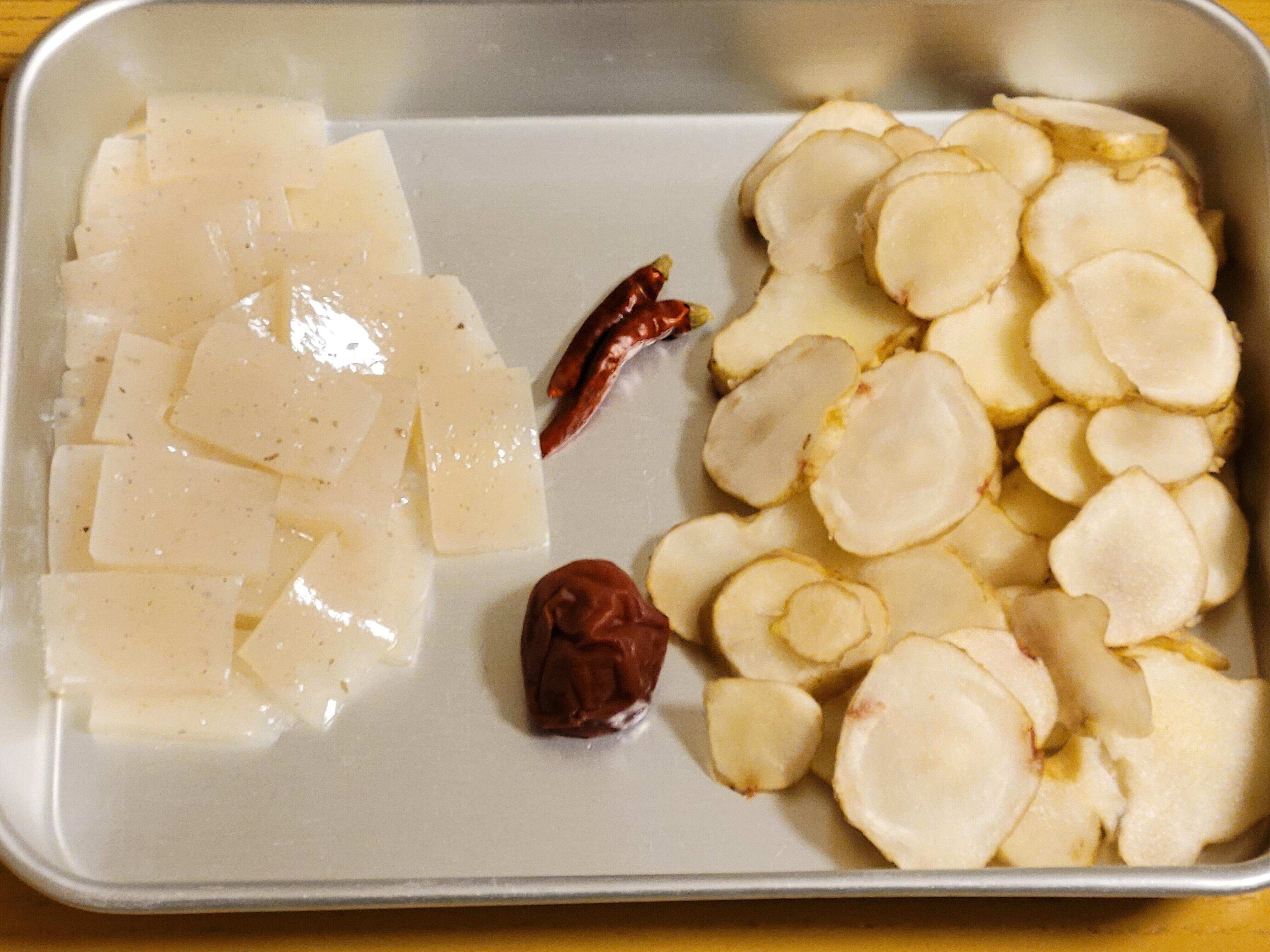 2.こんにゃくは薄くスライスして食べやすい大きさに切り、あく抜き不要のものはそのまま、あく抜きが必要なものは茹でてあく抜きして使用する。