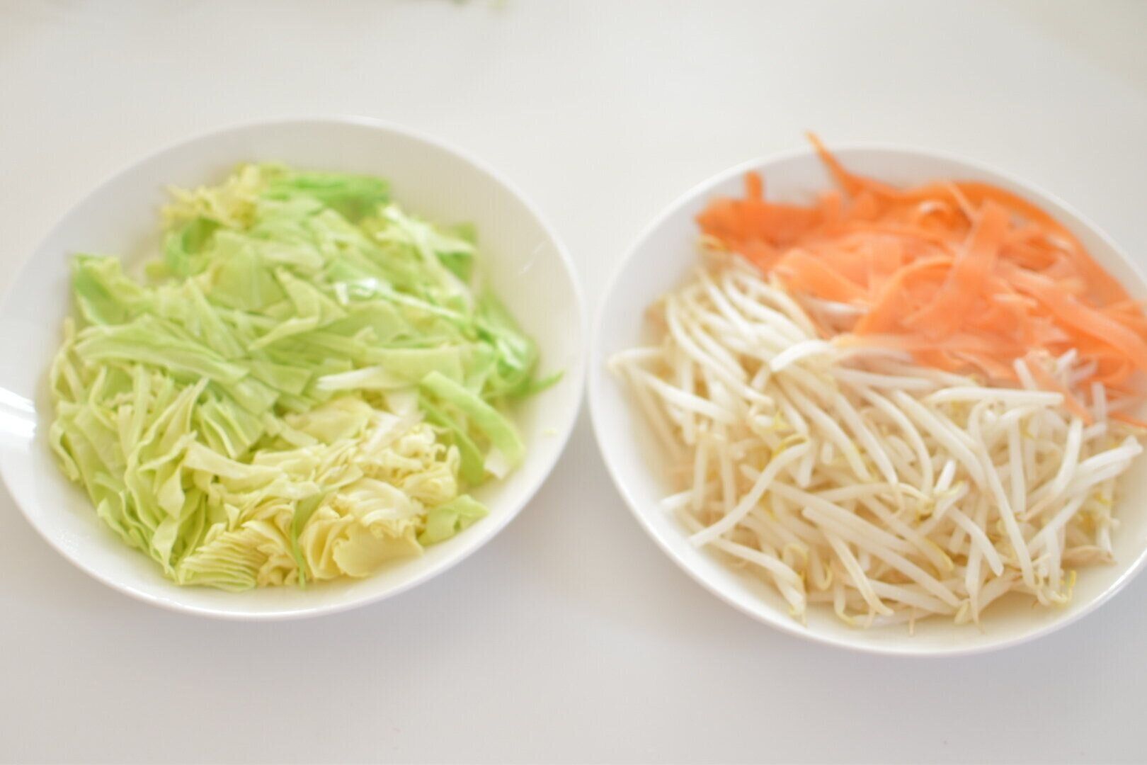 耐熱皿にキャベツ、もやしなどお好みの食材を乗せてラップをします。