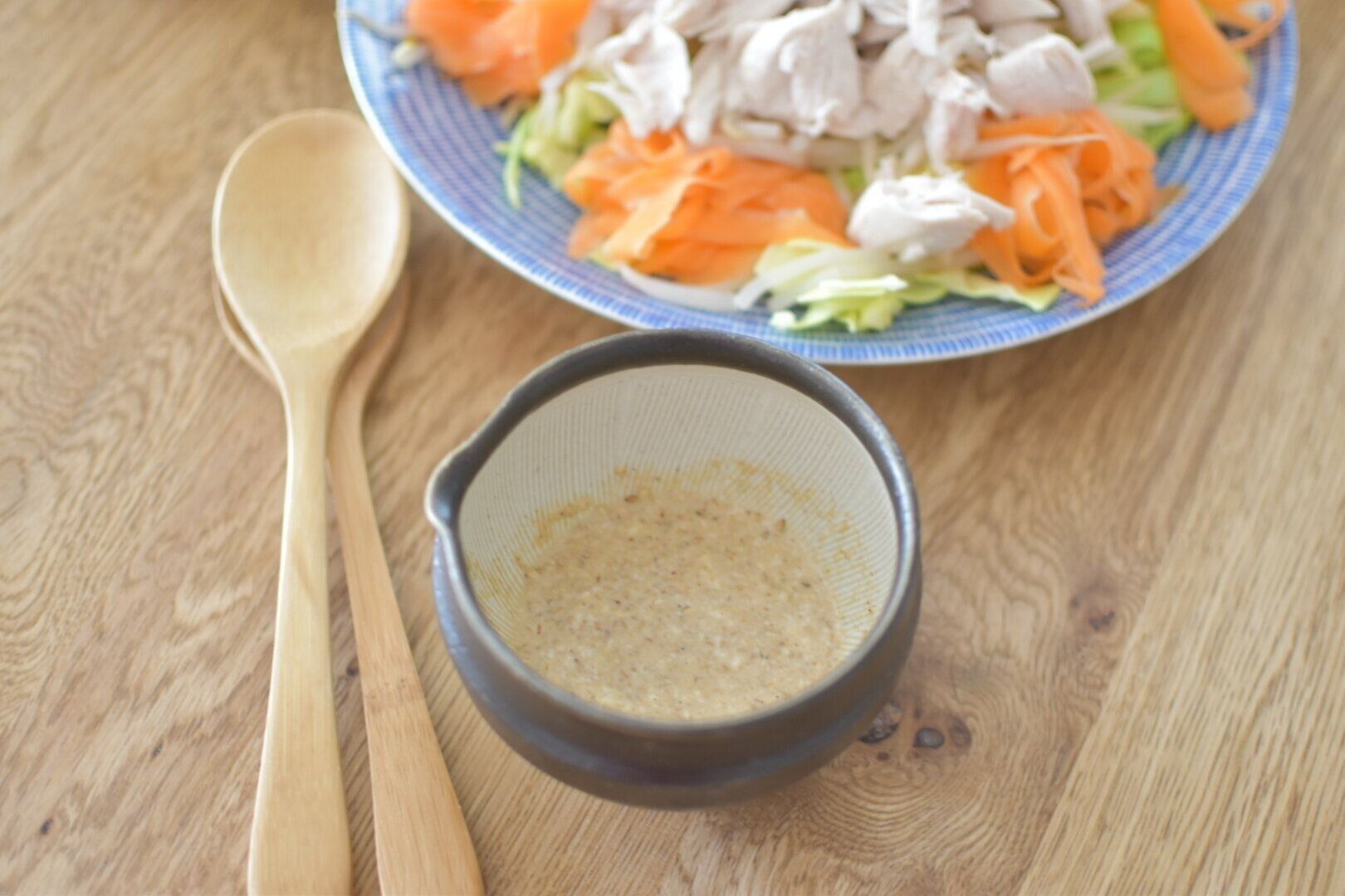 バンバンジーに欠かせない"ごまダレ"も冷蔵庫に常備している調味料でささっとつくります。