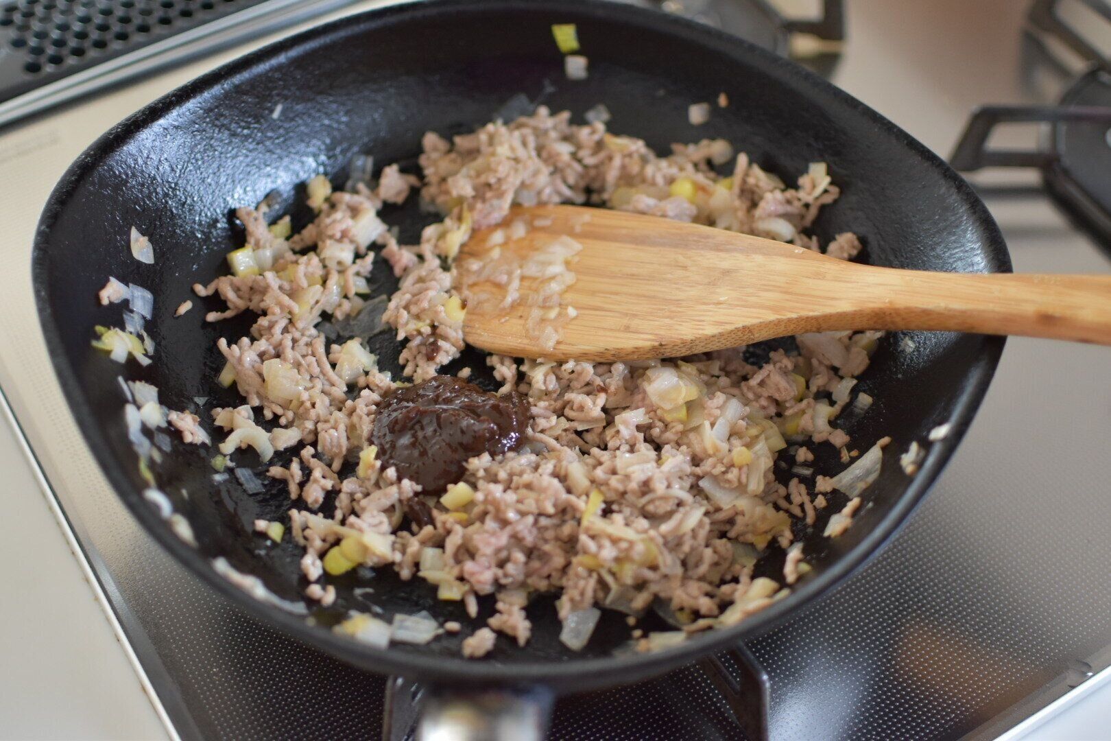 1.サラダ油をなじませたフライパンで、みじん切りにした白ネギ、豚ひき肉を中火で炒めます。お肉に火がとおったら弱火にして、しょうが、にんにくチューブを3cmほど加えます。