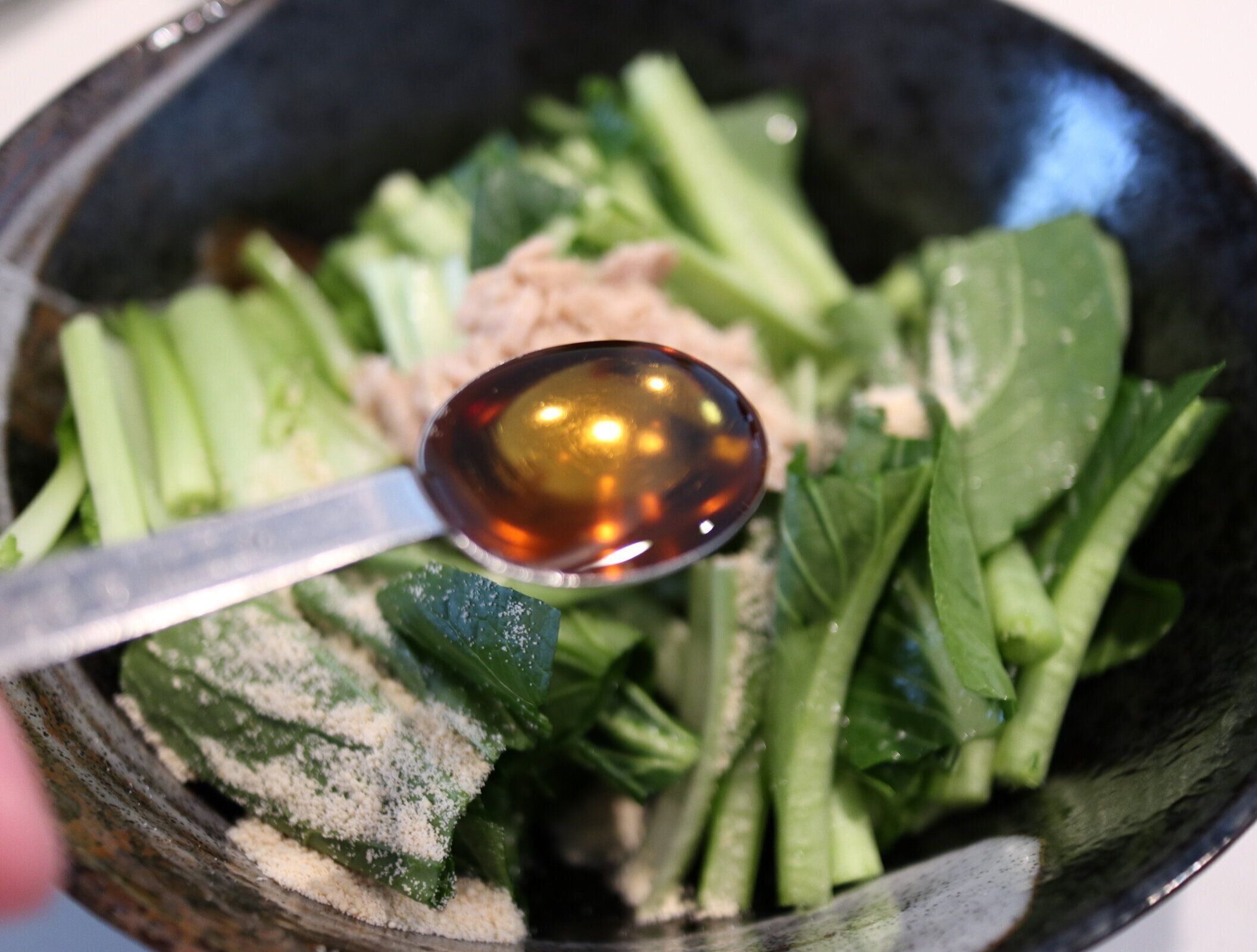 (2) (1)に鶏ガラスープ、ごま油を入れ、サッと和える。