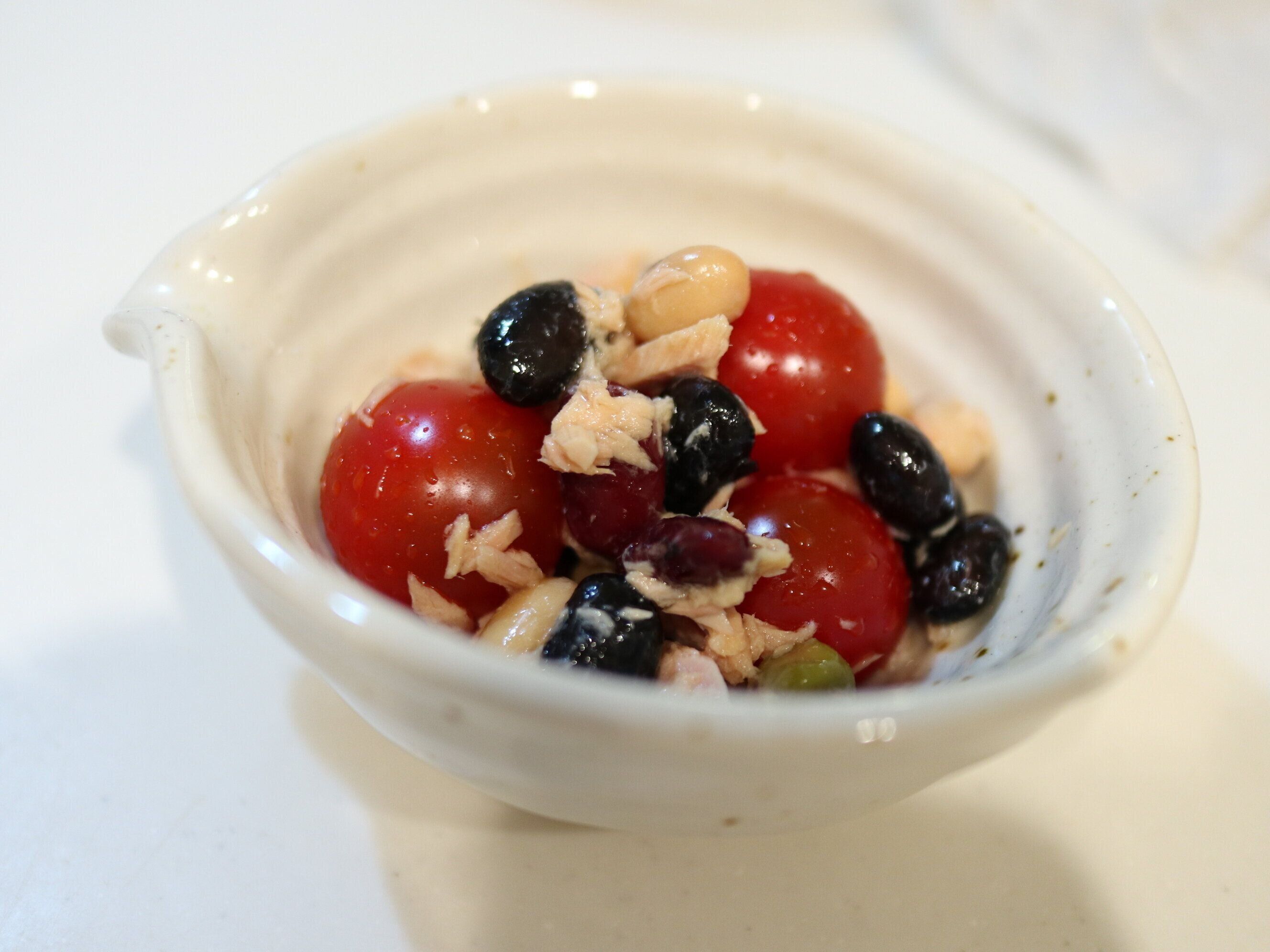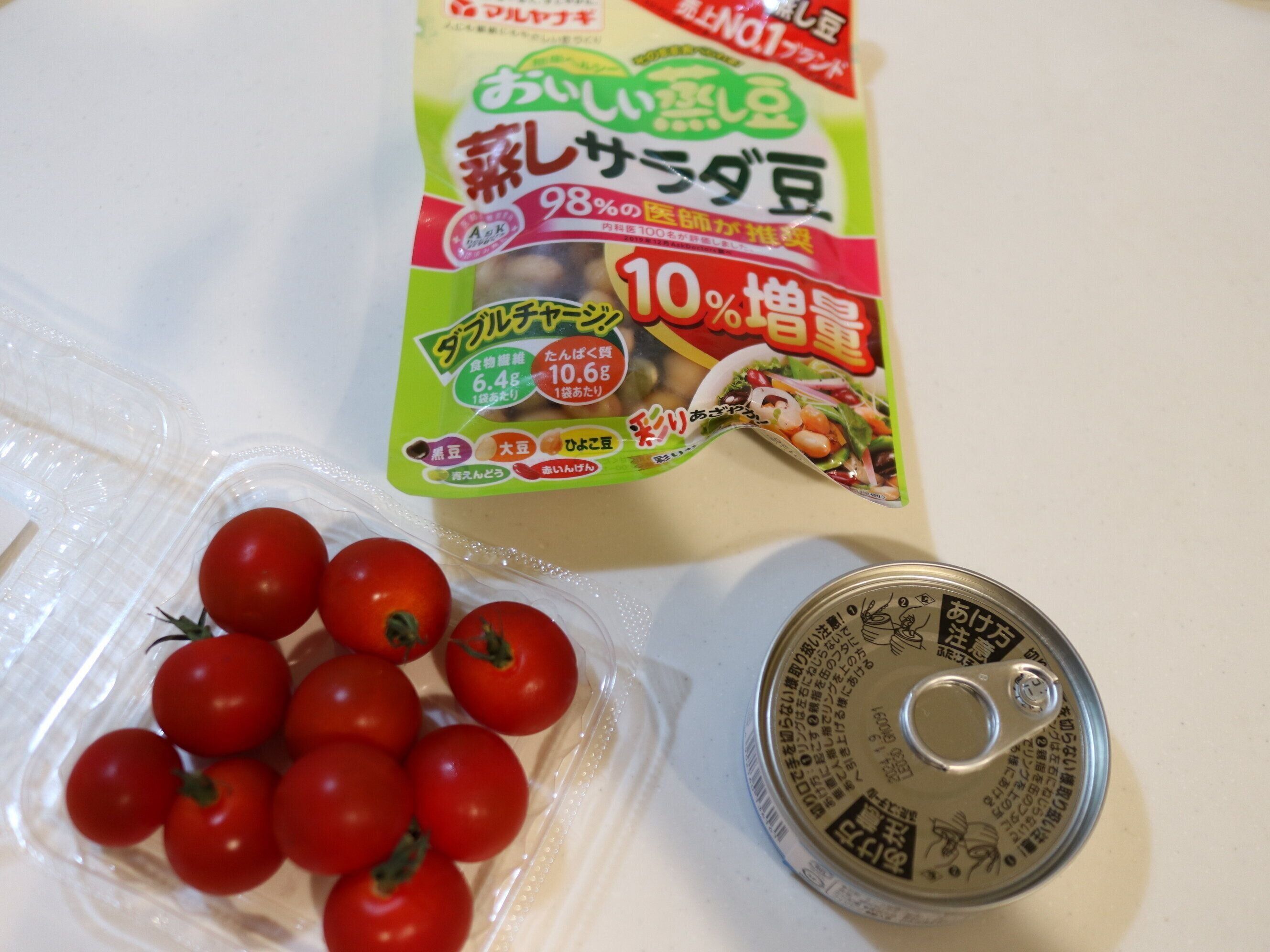 (1)ミニトマトはサッと洗い、水気を切って蒸しサラダ豆と一緒にボウルに入れておく。