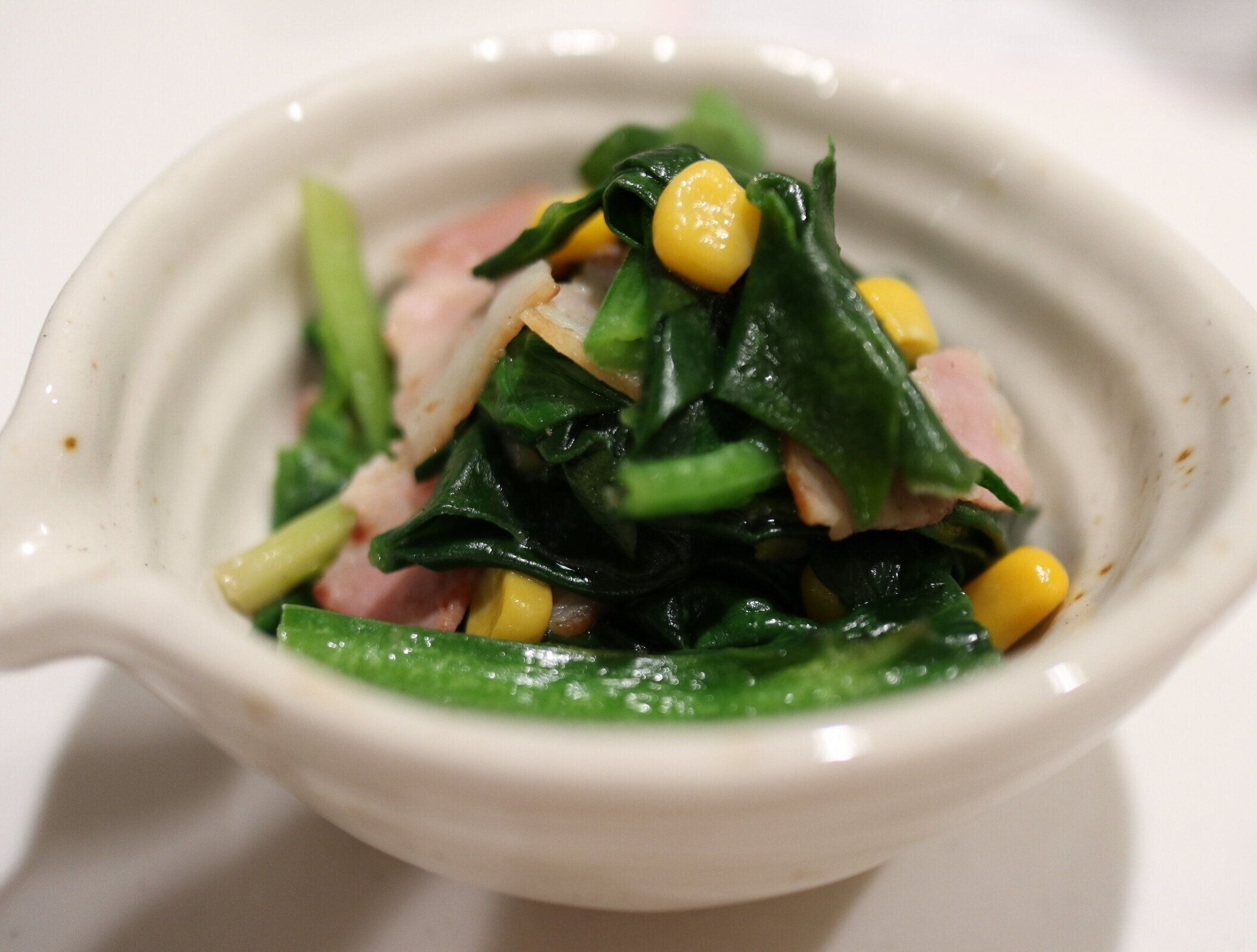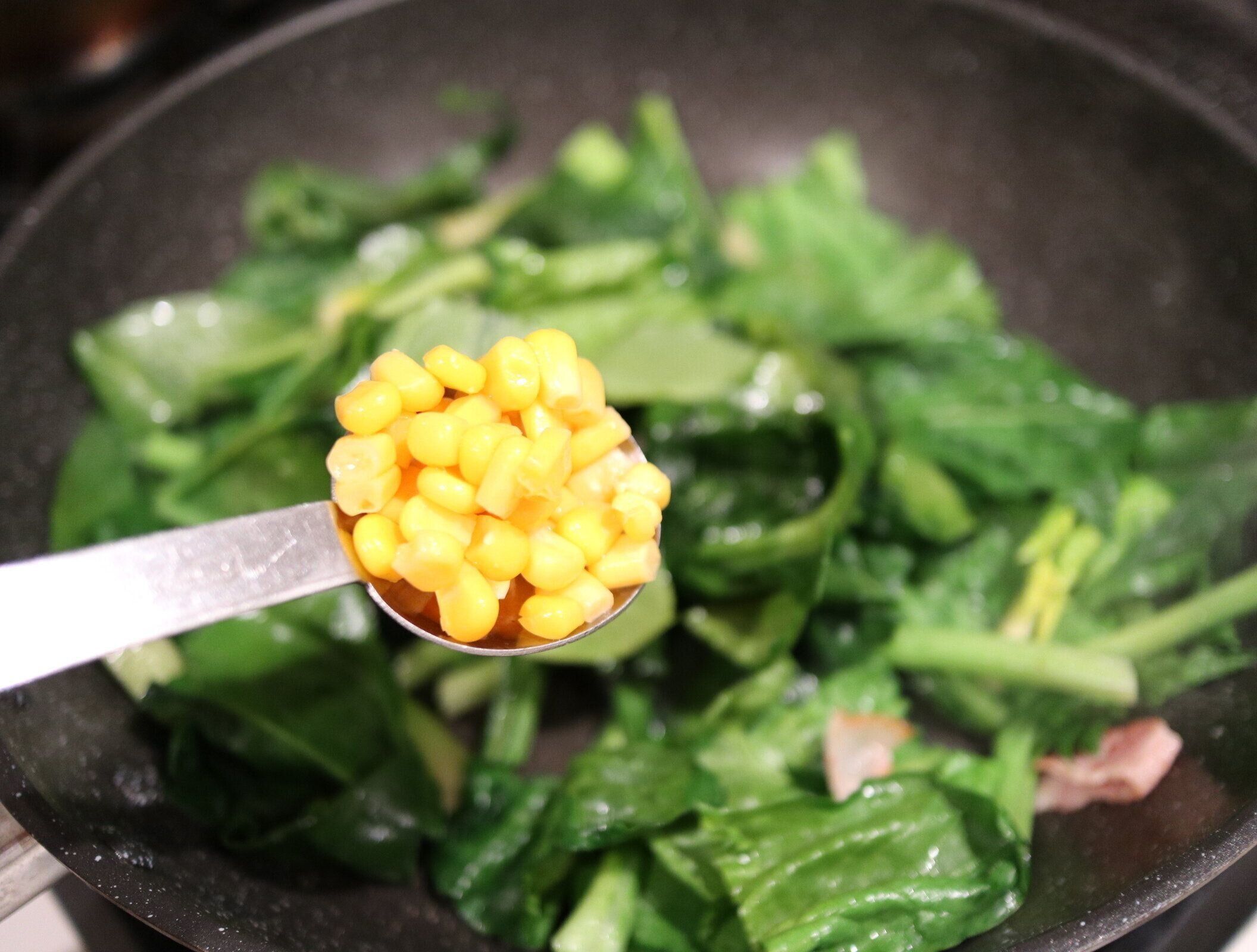(2)オリーブオイルをひいたフライパンを熱し、ベーコンをカリカリになるまで炒める。その後、切っておいたほうれん草・コーンを入れ、しんなりするまで炒める。
