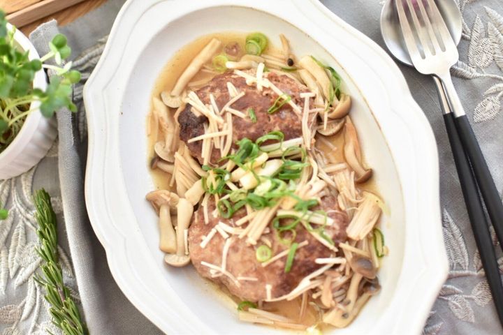 たっぷりのきのこと一緒に煮込んだ和風ハンバーグの味付けもめんつゆにおまかせしています。簡単だけど子どもがよろこんでくれる我が家の定番レシピに。