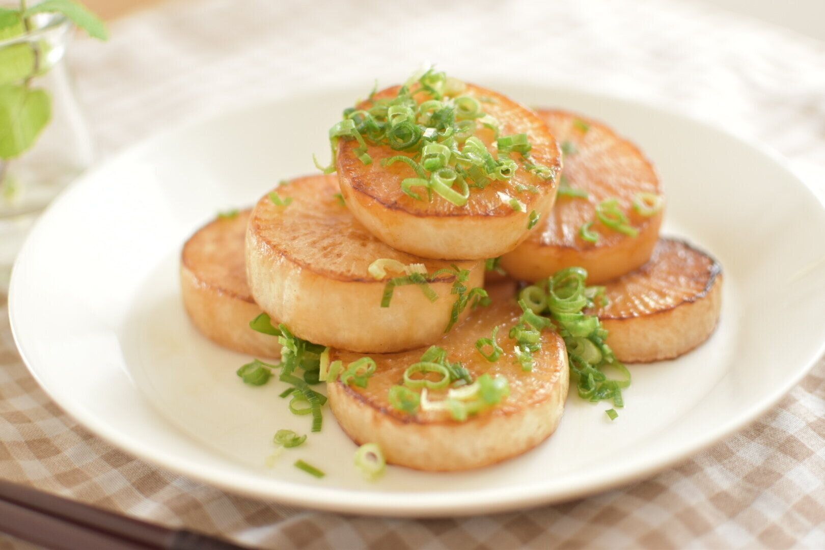 ごま油でこんがりと焼いた大根ステーキの味付けにめんつゆを使います。