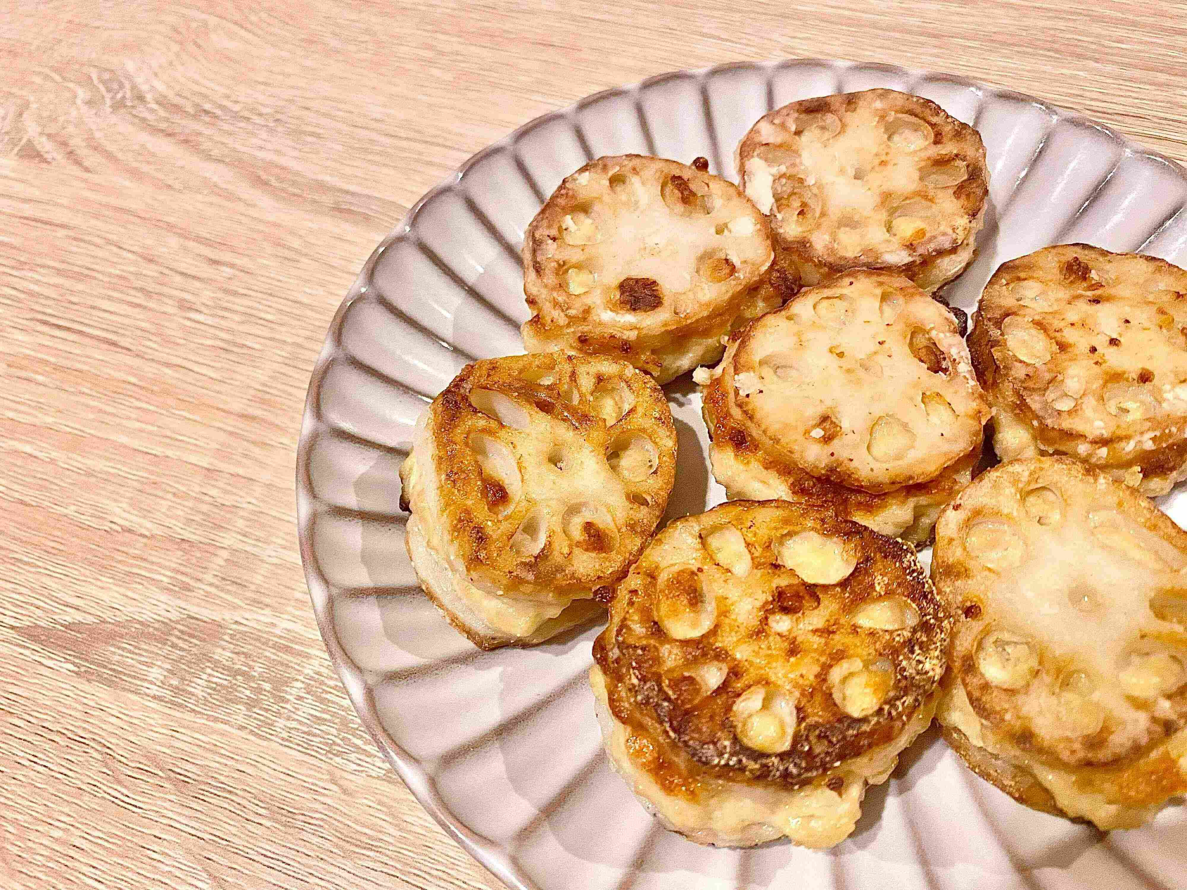 れんこんを具ではさむときは、同じ大きさのれんこんを使って下さい。なるべくたっぷり片栗粉をまぶし、余分な粉は落としておくとGood。