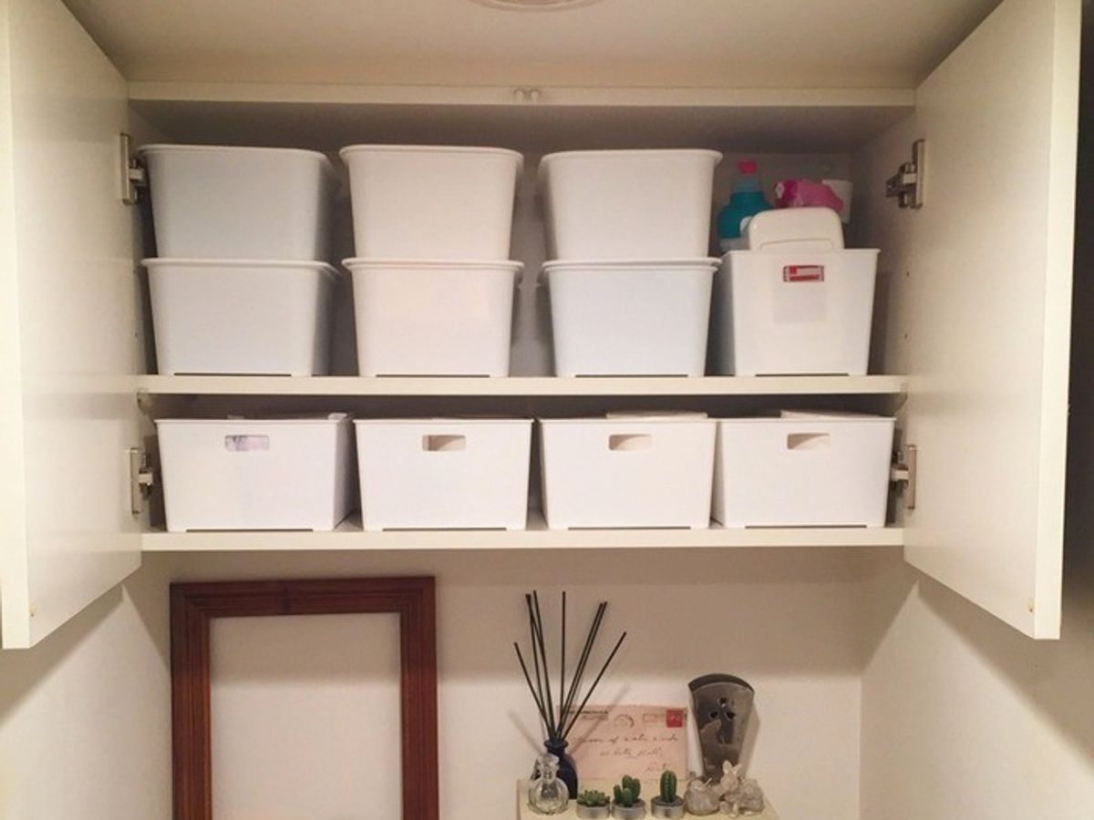 atsuko_okunoさんはトイレ上収納を見せてくれました。高い位置にある棚ってついついデッドスペースになりがち。そんな時には100均のボックスで種類分けをして、取り出しやすくしましょう。