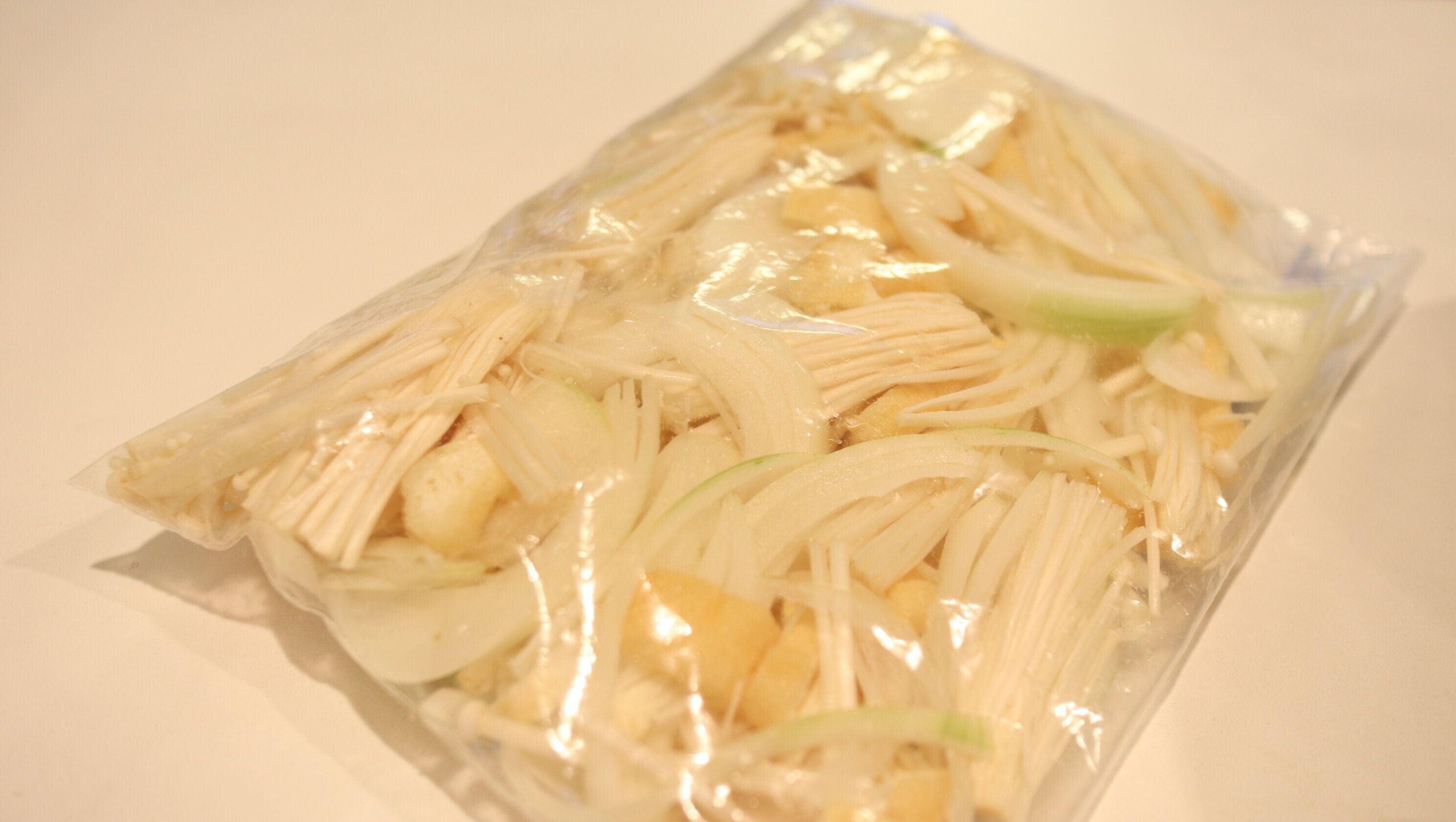 玉ねぎ・キノコ・油あげなど、3~4種類くらいの食材をミックスして、自家製「汁物ミックス」に!