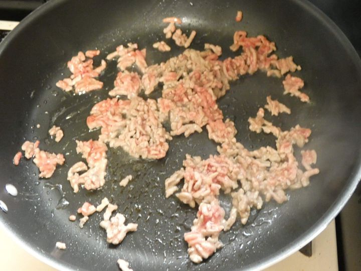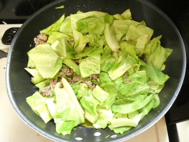 2.油をひいたフライパンにひき肉を入れて炒めます。色が変わったらキャベツを入れます。