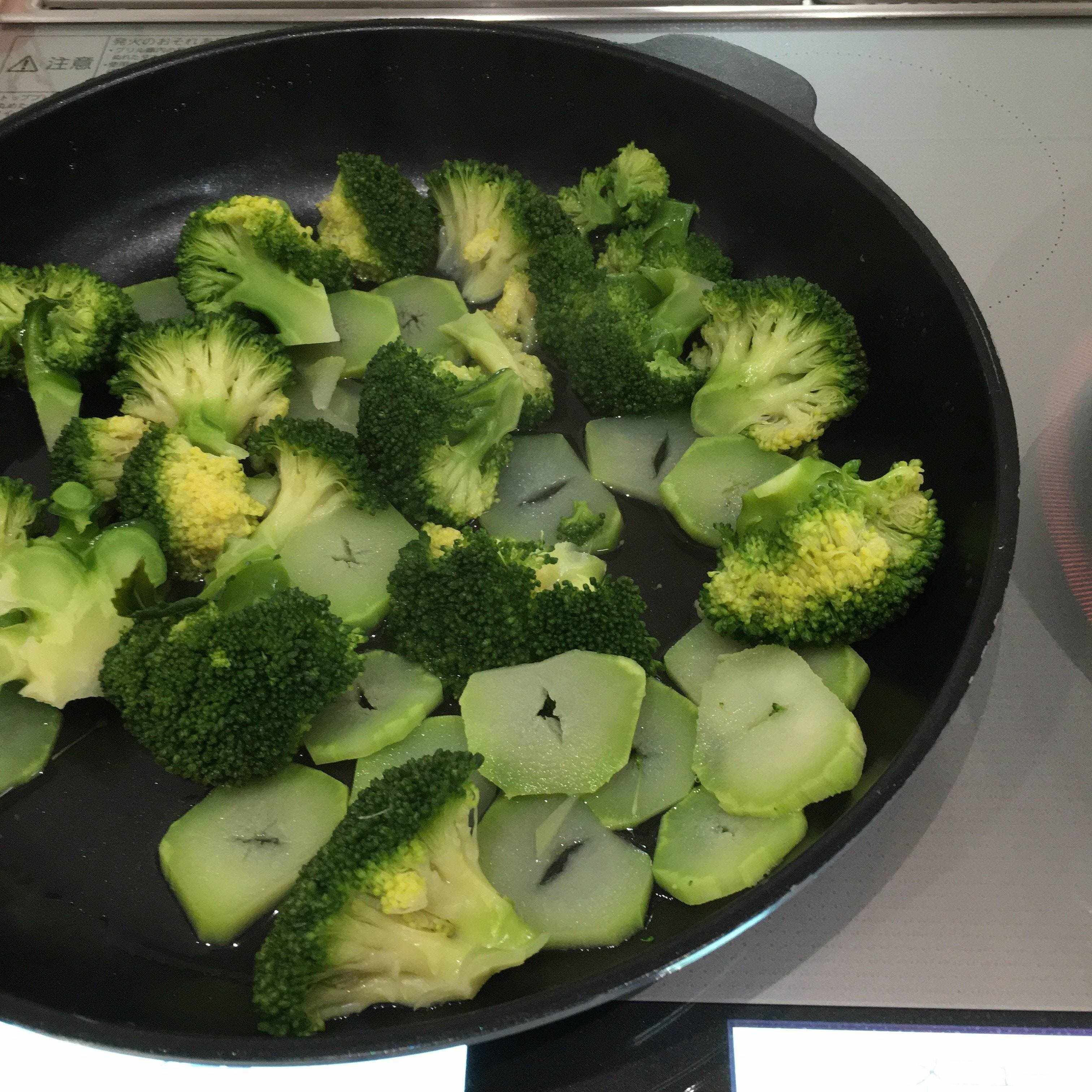 「蒸しゆで」は切った野菜をフライパンに入れて大さじ3くらいの水を入れて蓋をするだけです。野菜の種類にもよりますが数分すると、柔らかくゆで上がります。ブロッコリーはたった3分です。