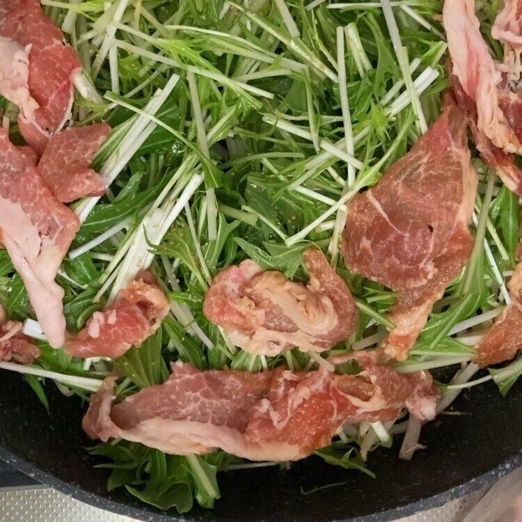 4cmくらいにざく切りした水菜・洗ったもやしを、フライパンにもやし・水菜の順に入れて、酒と顆粒和風だしをふる。