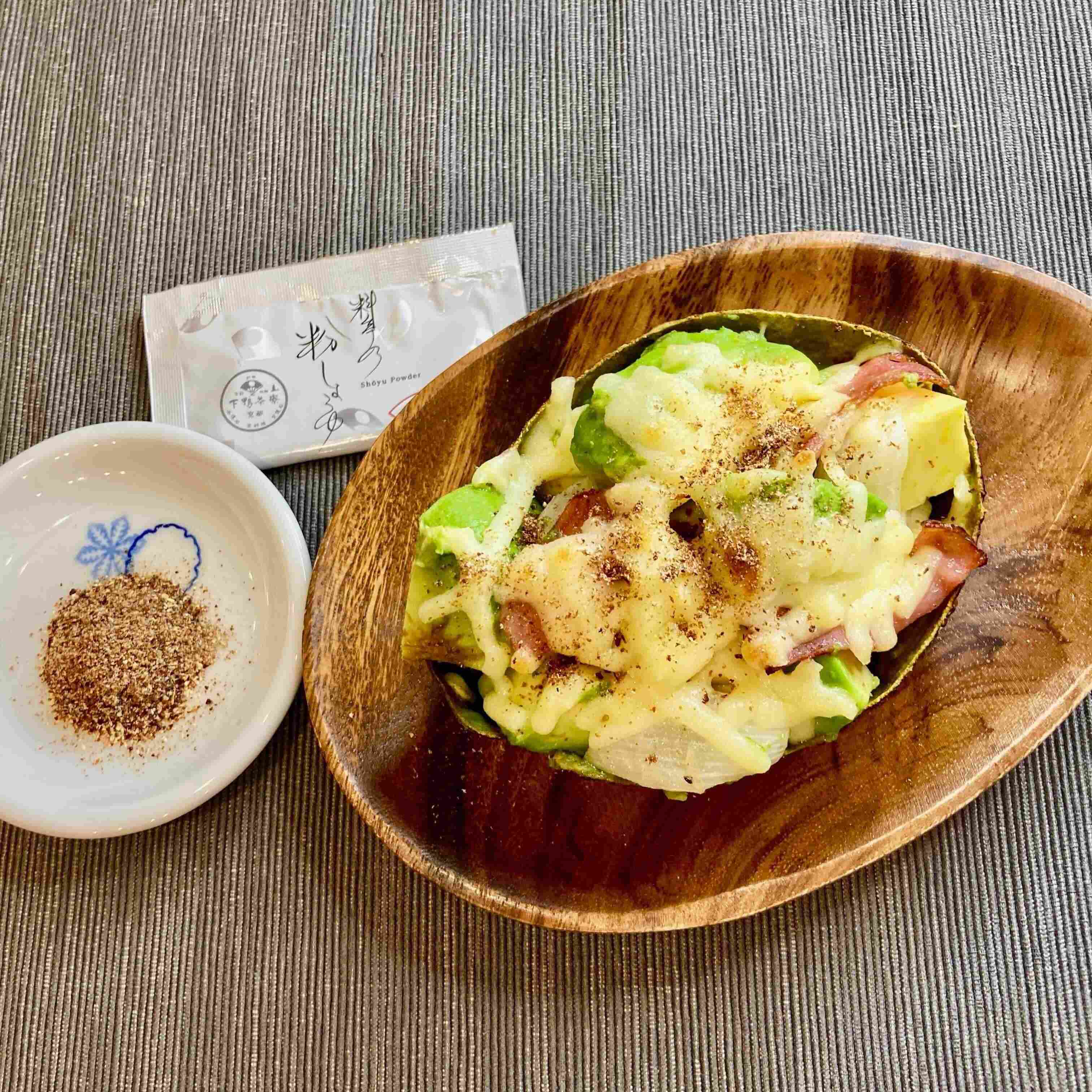 ・1cm幅ほどに切ったベーコン、スライスした玉ねぎと和え、アボカドの皮を器にして入れる。