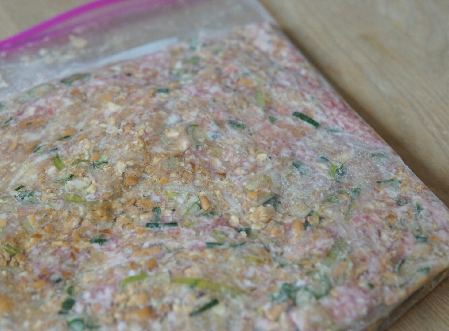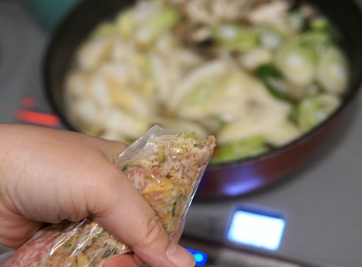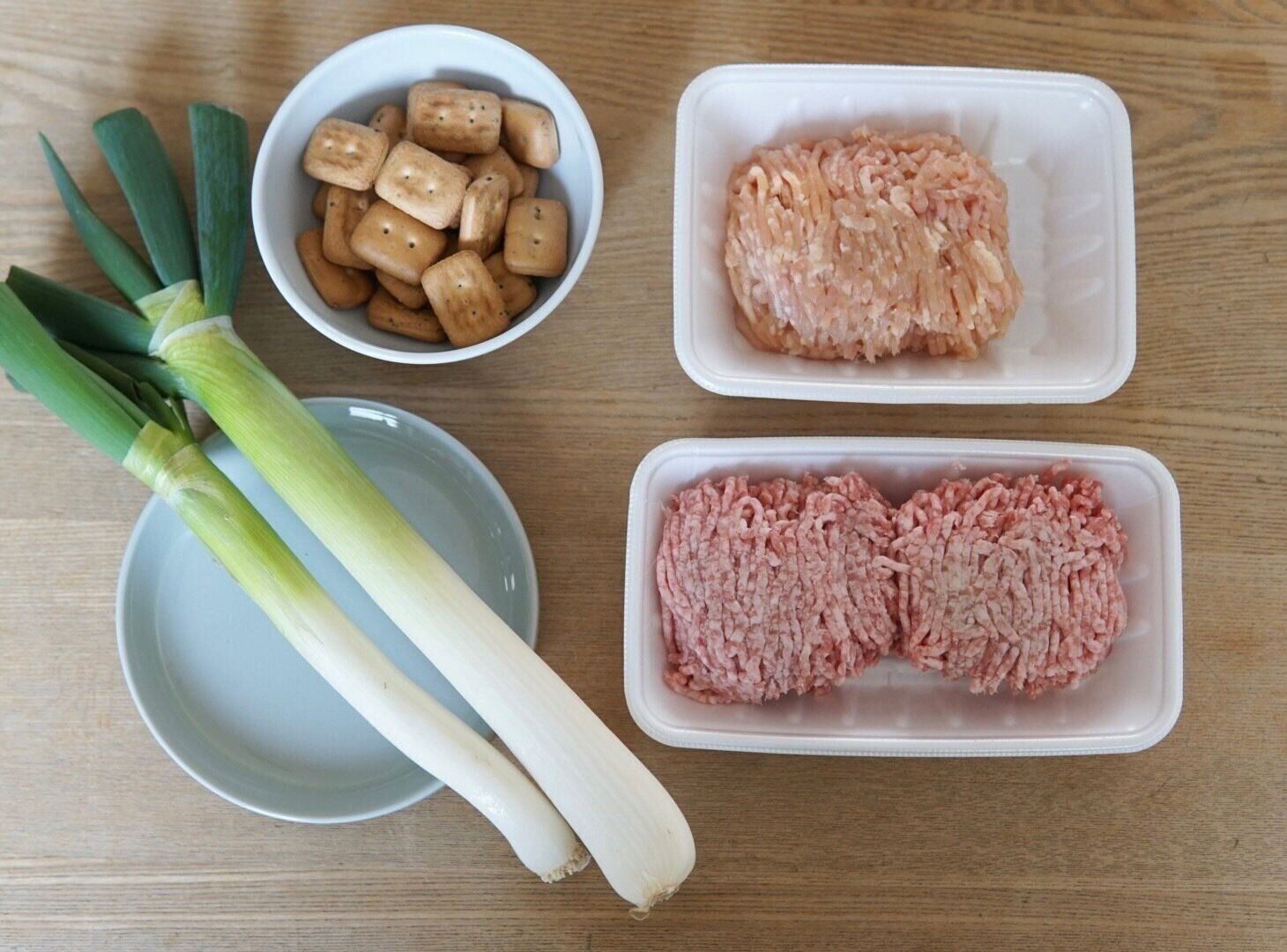 乾パンを袋に入れて麺棒などでたたいて大きめに砕いたら残りの材料を入れて混ぜ合わせ、食べやすい大きさにまとめる。そのまま鍋の具として使用する。(注:わが家では、レシピどおりではなく鶏と豚のひき肉をあわせてつくりました)