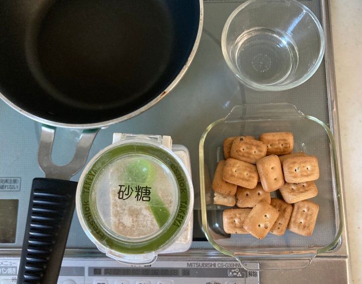 ■砂糖40gに対して水小さじ2の割合でフライパンで中火で温める。ぷつぷつ沸騰してきたらカンパン(100g~150gくらい)を入れてからめる。水分がなくなってきたらオーブンシートの上に取り出し乾かして完成。