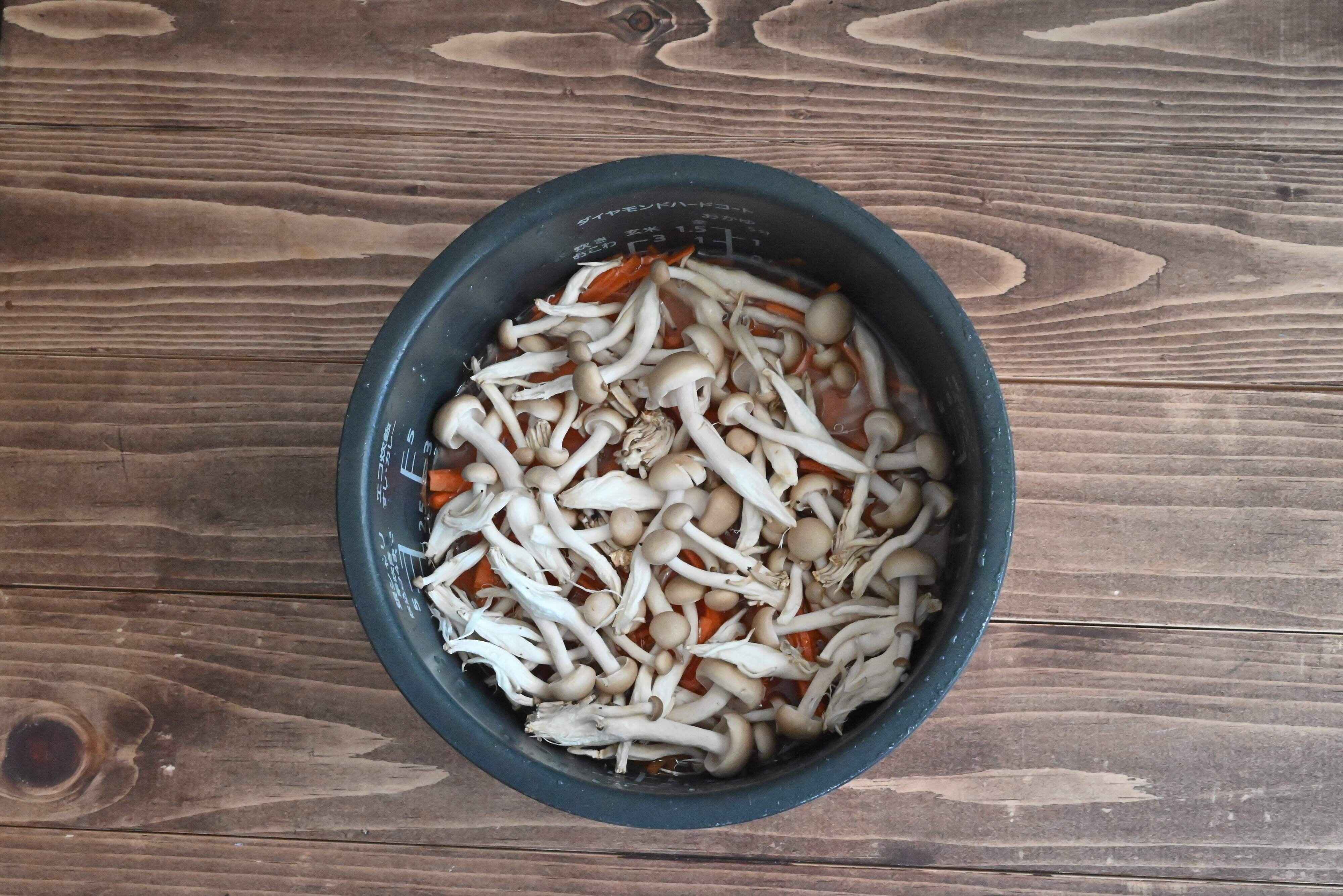 (3)にんじん、しめじ、ツナ缶を広げ入れ、通常炊飯する。