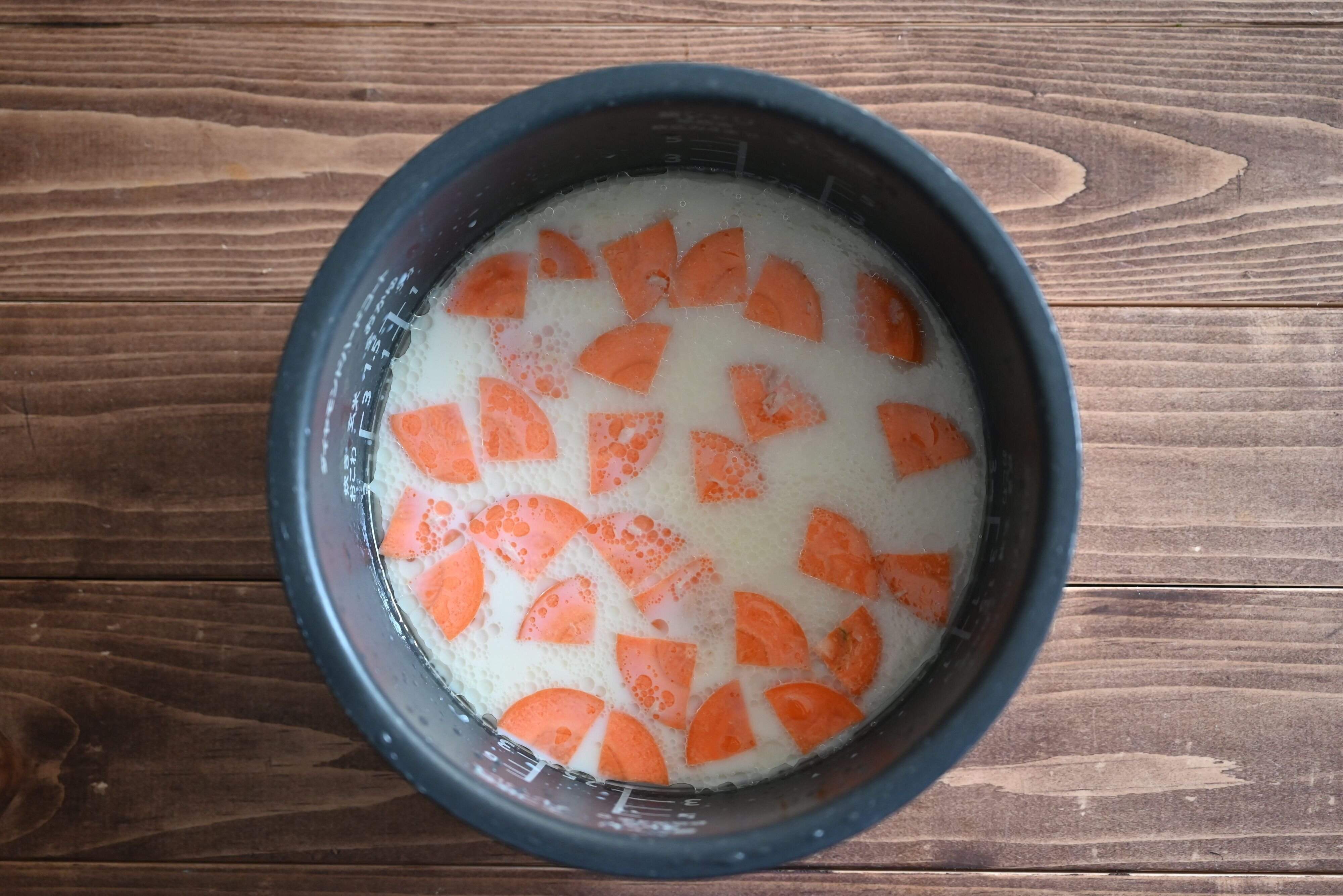 (3)にんじんとツナをのせて通常炊飯する。