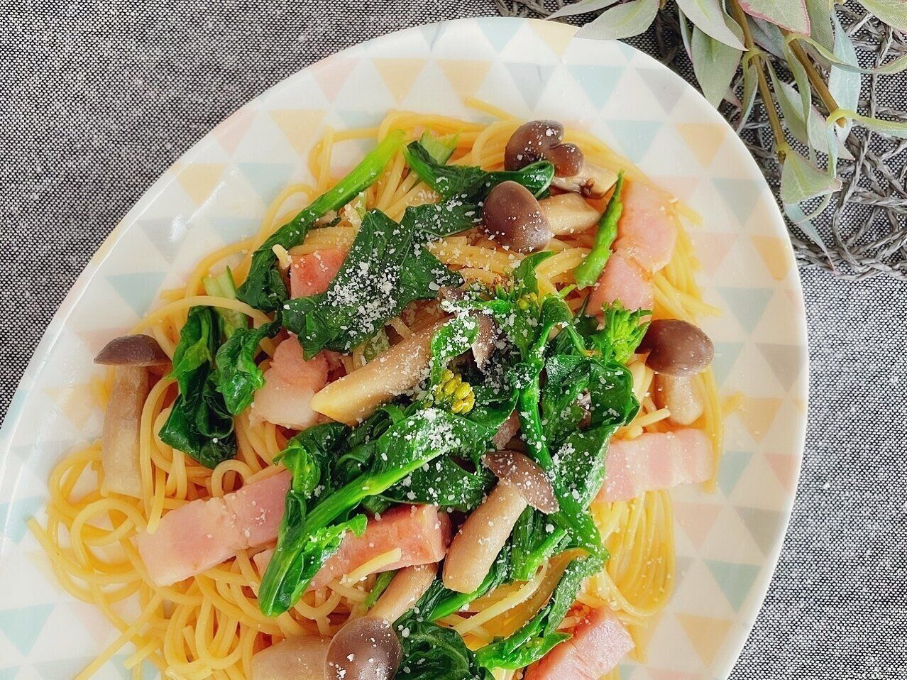 菜花とベーコンを具材にした和風パスタ。しめじも加えてボリュームと旨みをプラスします。