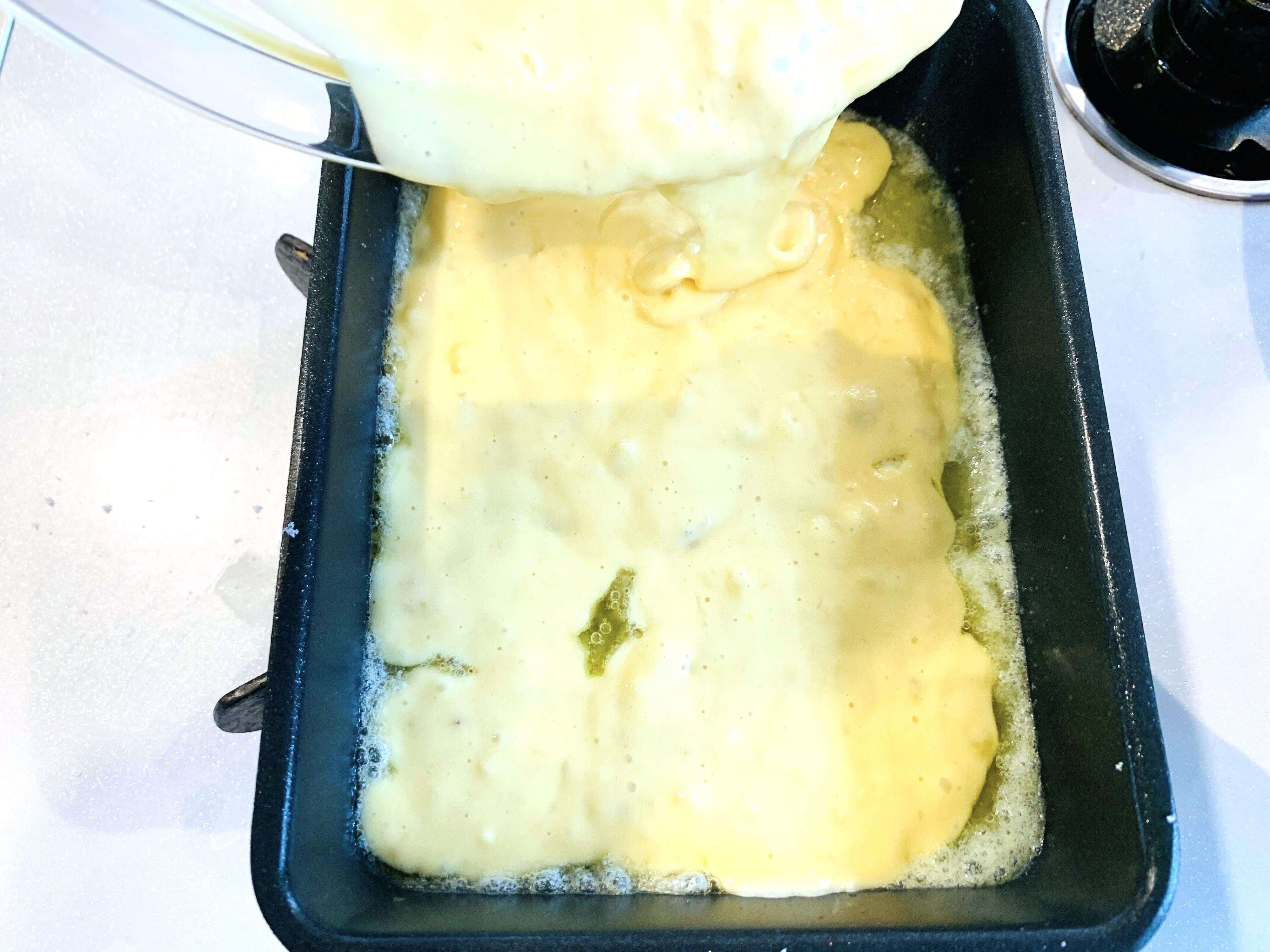 弱火のまま、生地を流し入れます。生地は卵焼きフライパンのまわりからグルっと円を描くように入れます。