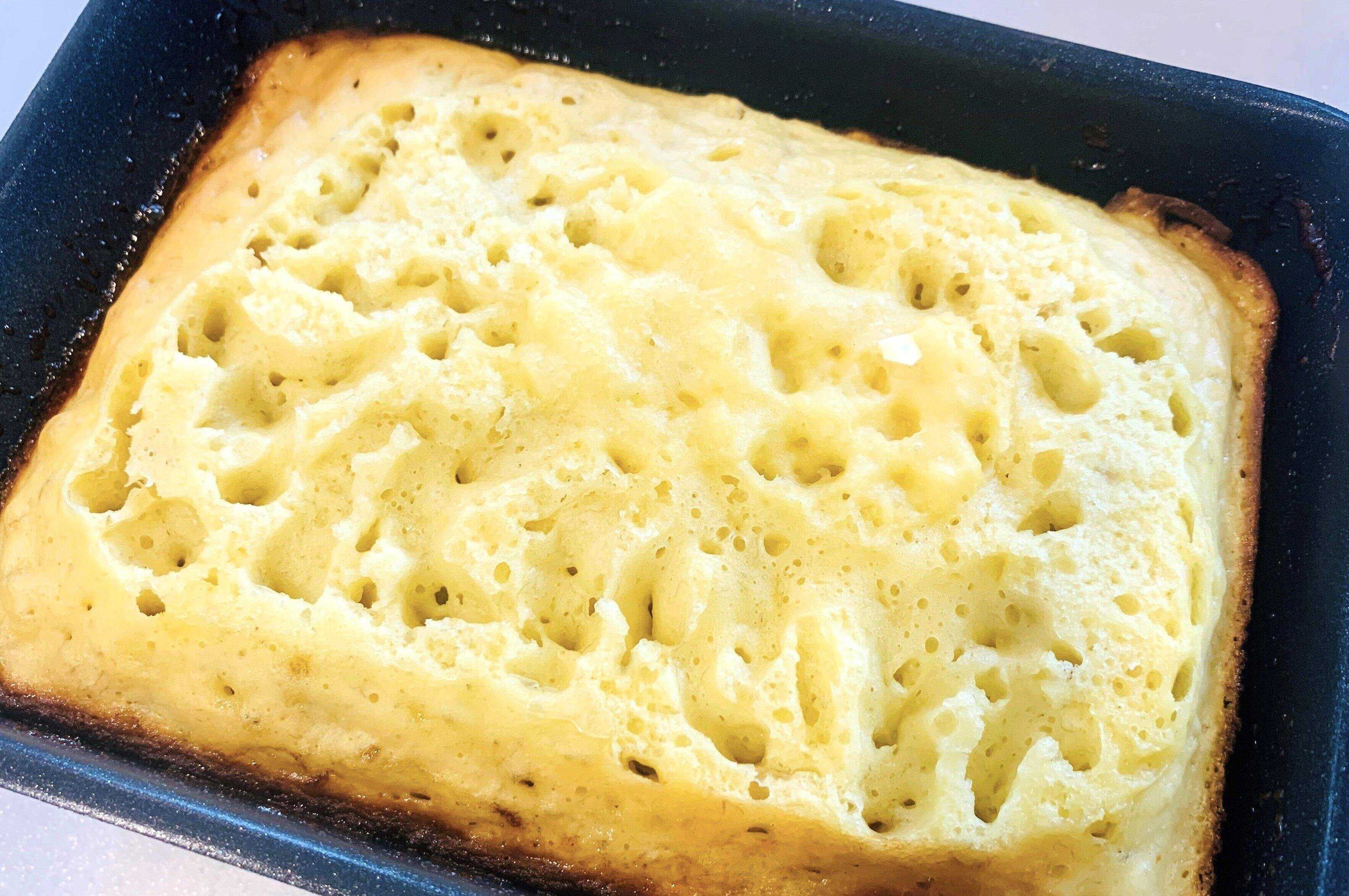 卵焼き用のフライパンで作ると、きっちりスクエア型に焼けるので、切り分けたときの見栄えがいいのもメリットです。焼き立てはフワフワ、時間がたつとしっとりしてきますよ。