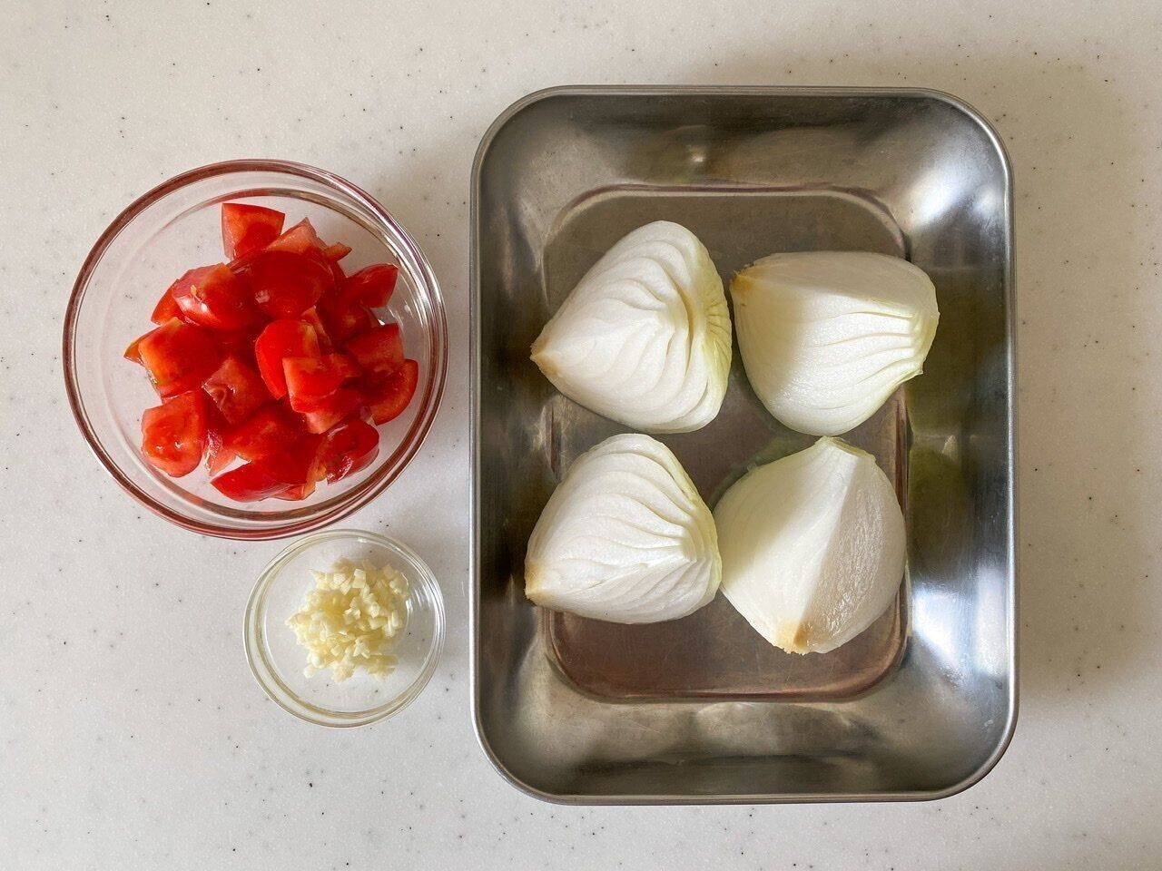 (1) 新玉ねぎは、根部分のみ落とし、茎がついた状態で4等分に切る。トマトは1cmの角切り、にんにくはみじん切りにする。