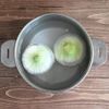 (2) フライパンにオリーブ油(約小さじ2)を熱し、断面を下にして新玉ねぎを並べて蓋をして焼く。途中3分~3分半ほどたったら、少し火を弱めてもう片側の断面を同程度焼く。焼き目がついたら外側の面を下にして2分焼いて器に取り出す。