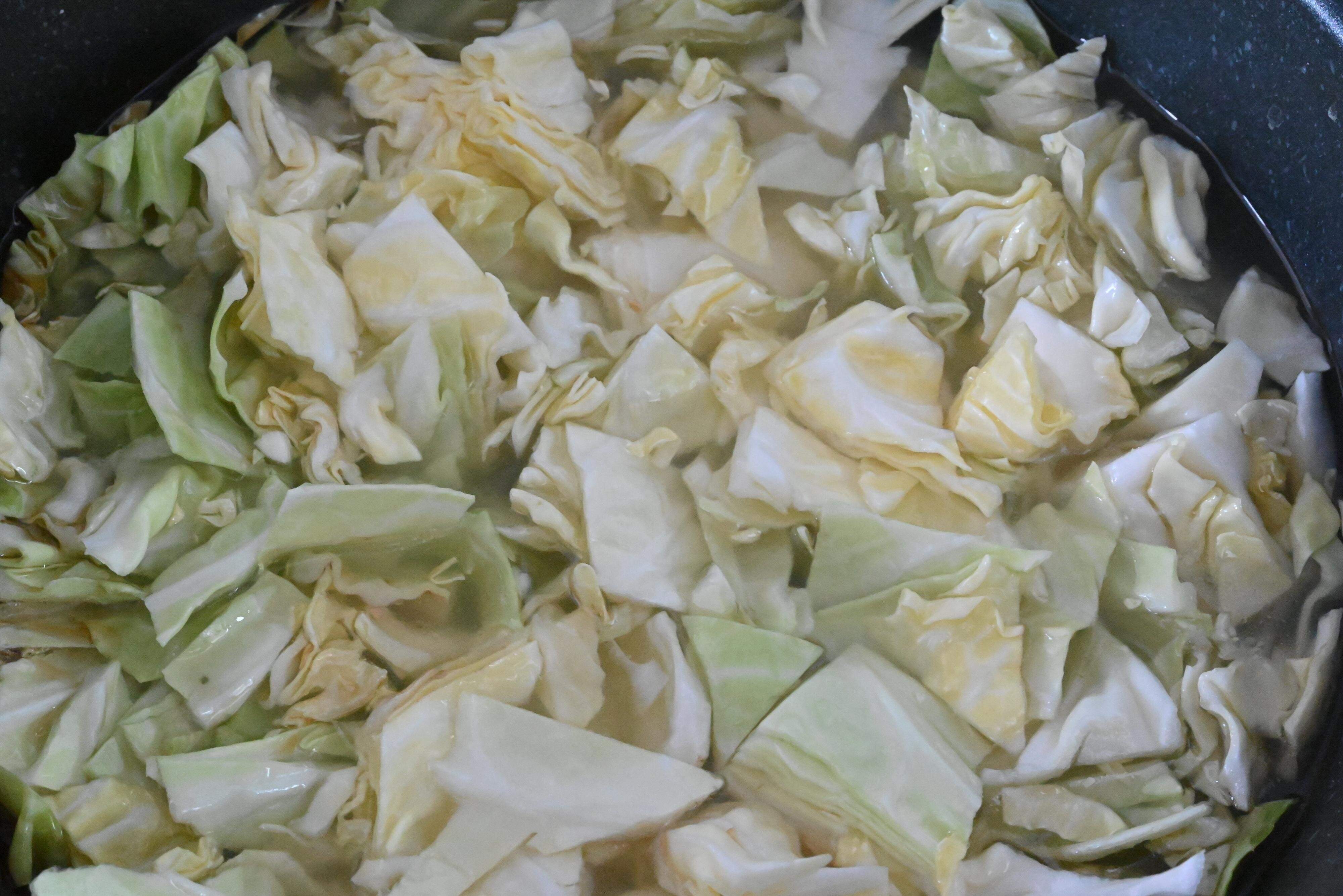 (1)キャベツはざく切りにし、水に5分ほどつけて水気を切る。