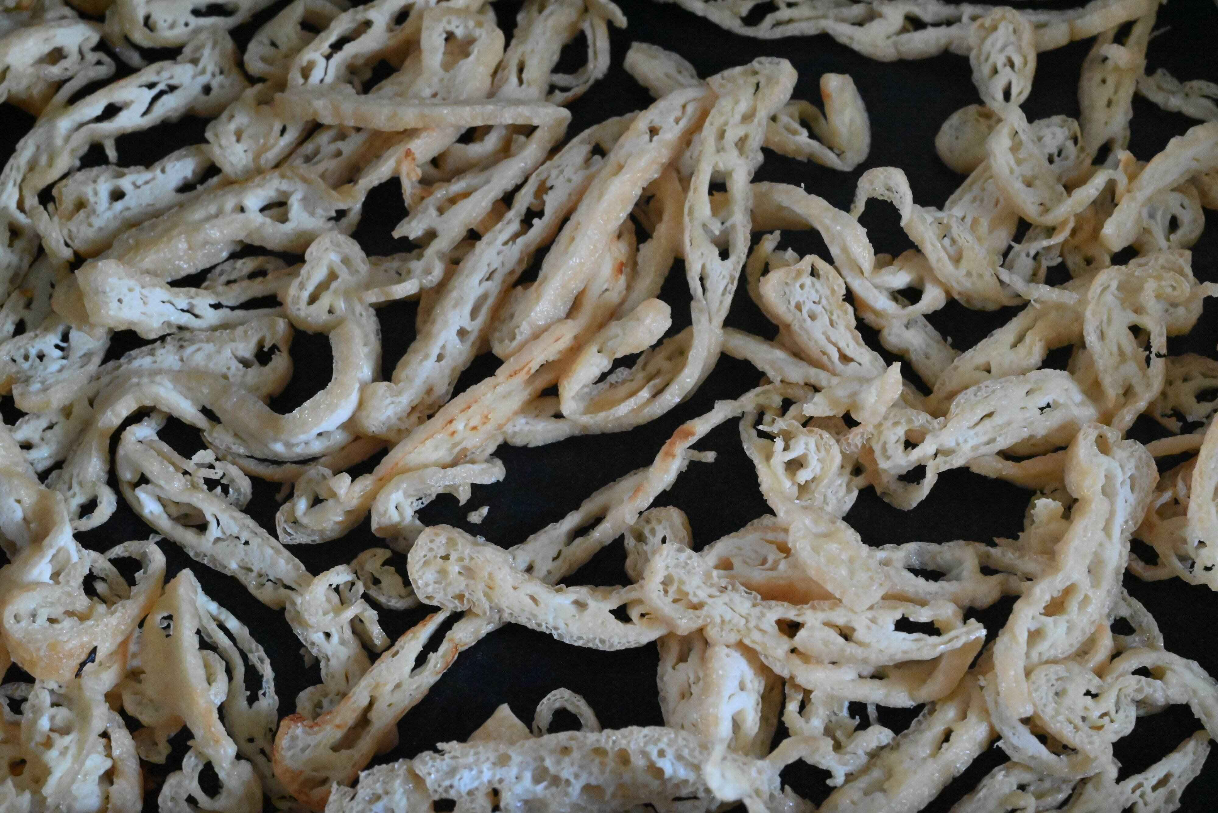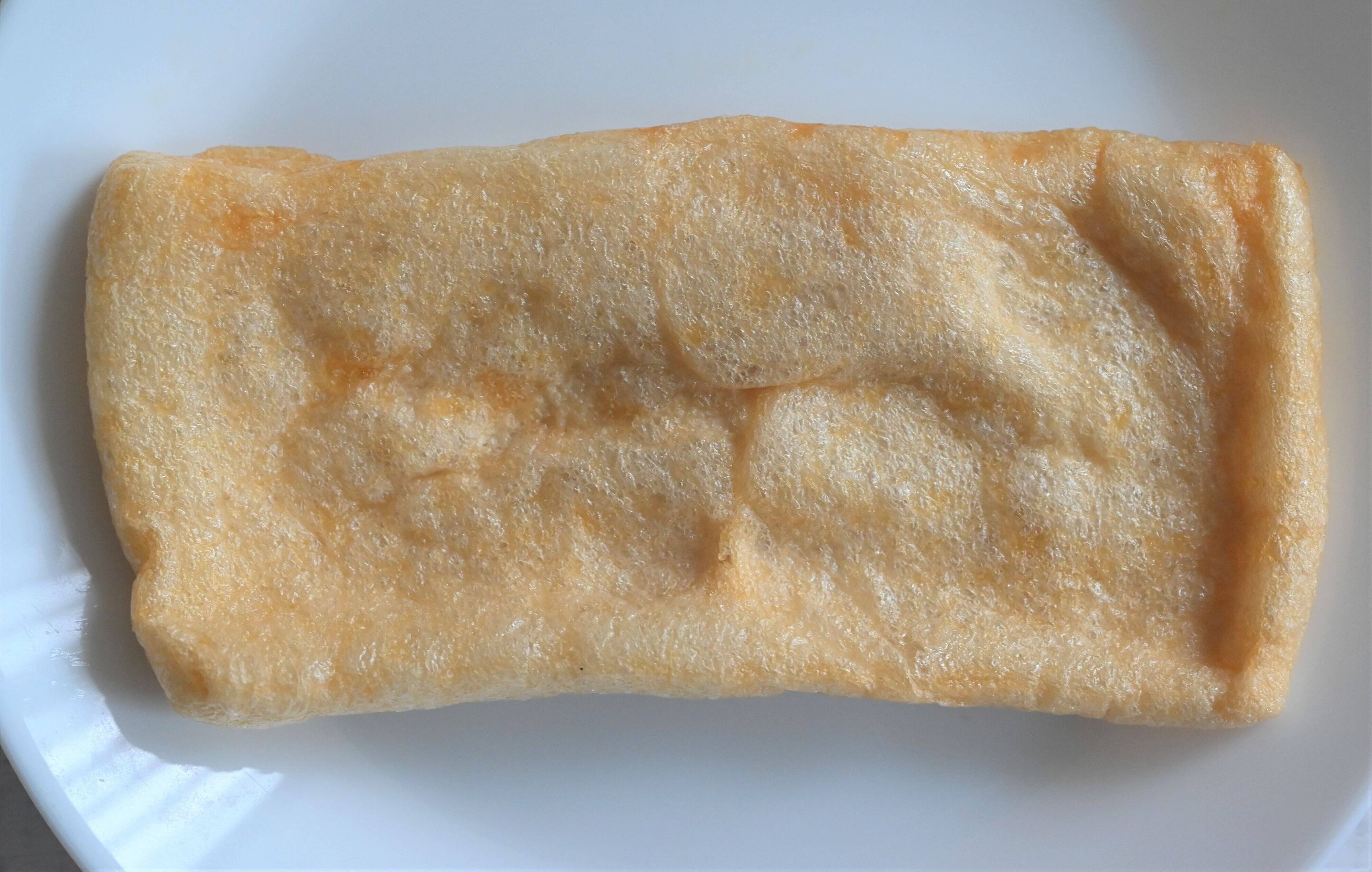 (2)油揚げはフライパンに入れて中火にかけ、カリカリになるまで加熱する。