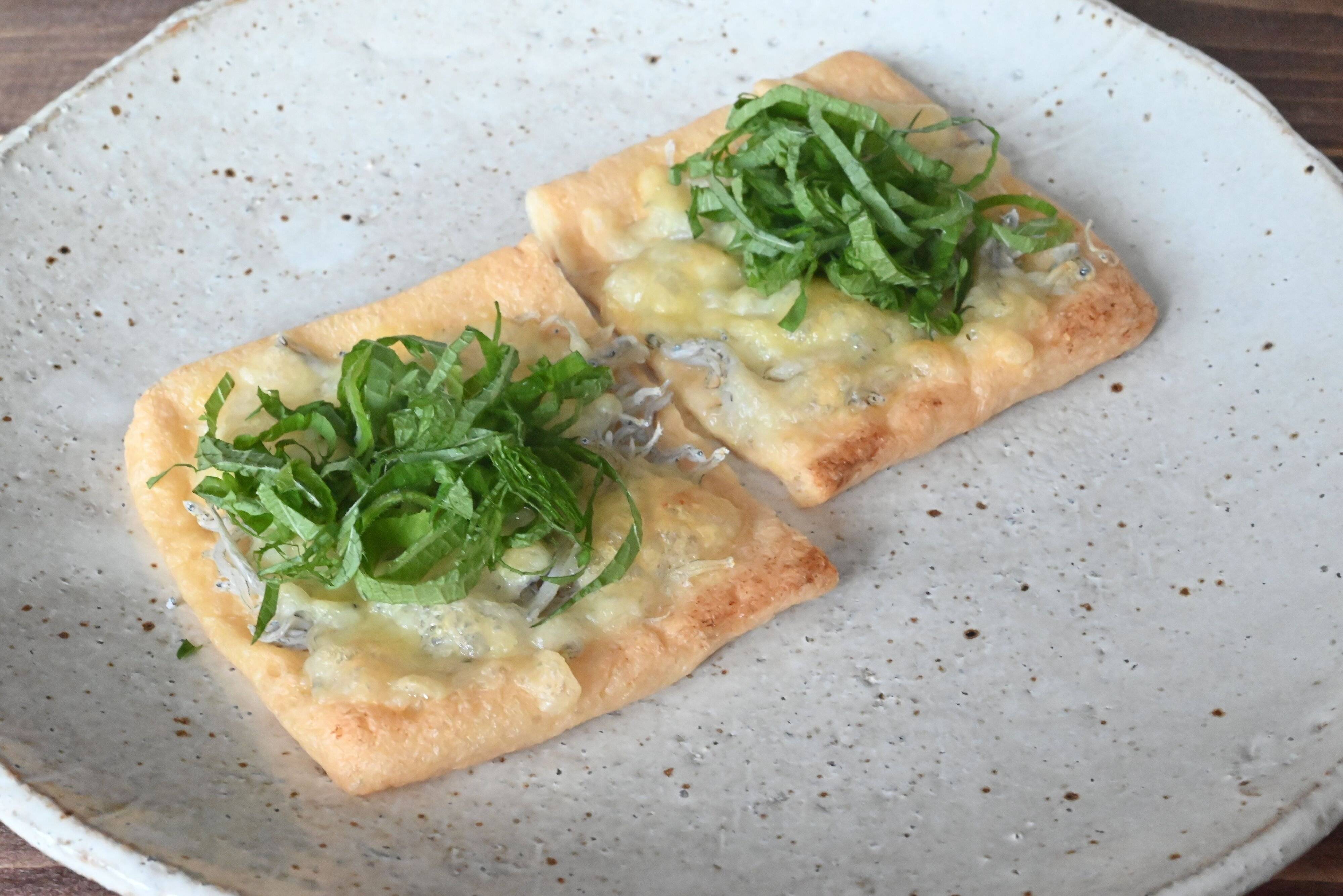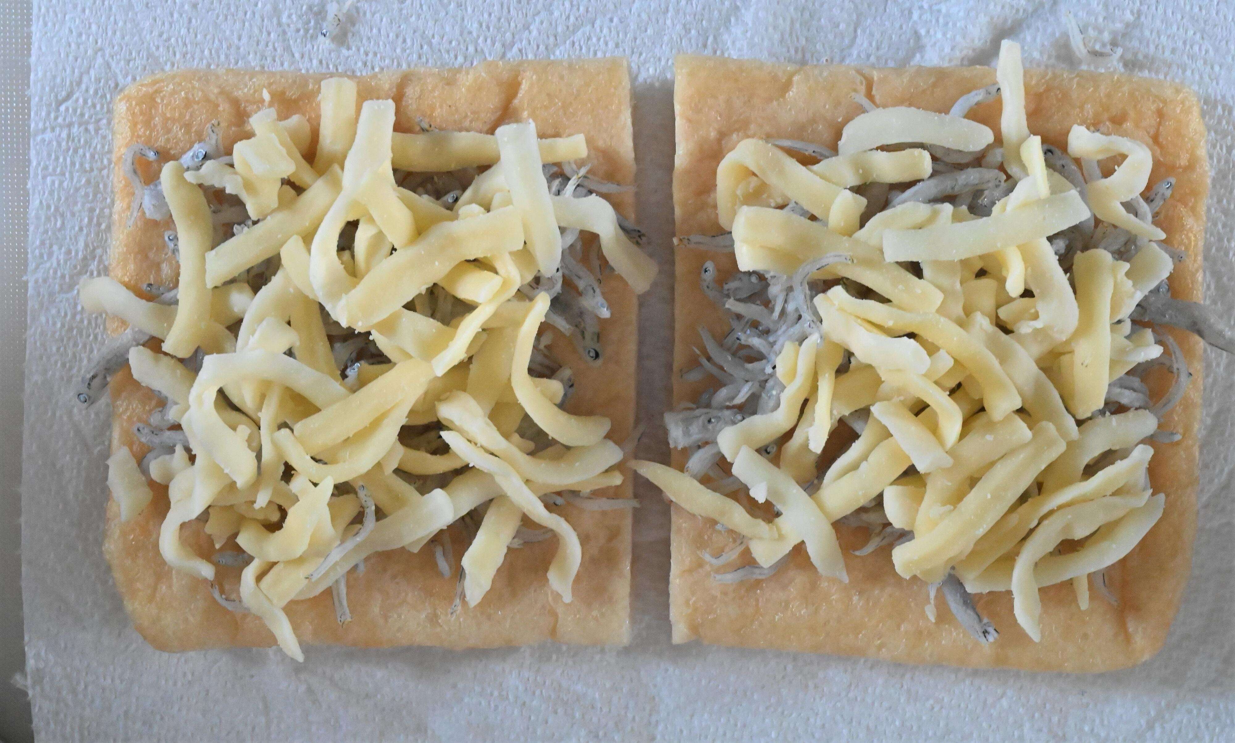 油揚げにしらすとチーズをのせて焼くレシピです。