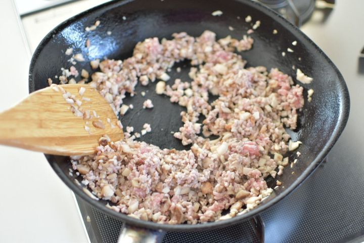 1.フライパンを弱火で熱し、合いびき肉を焼くように炒める。
