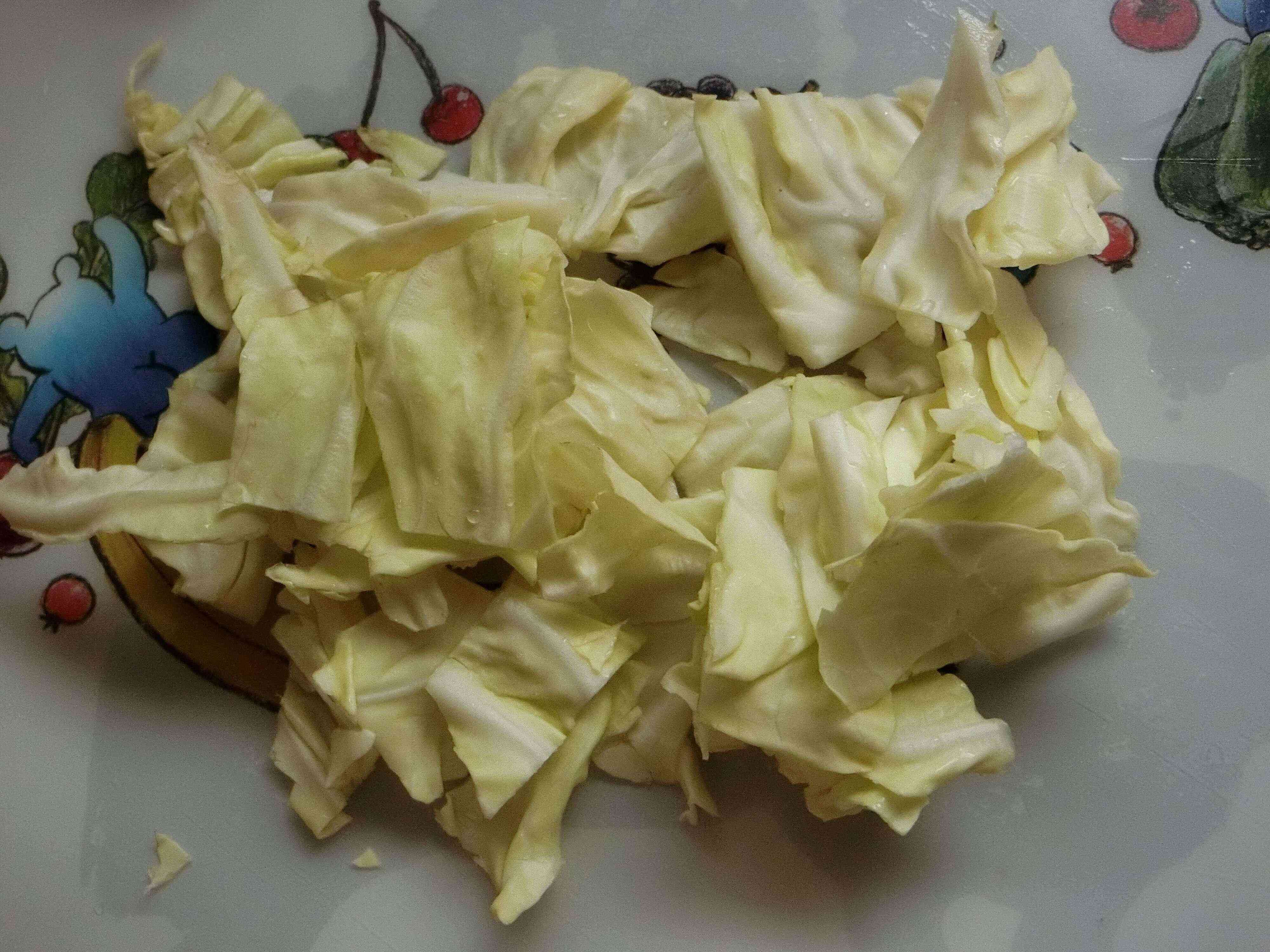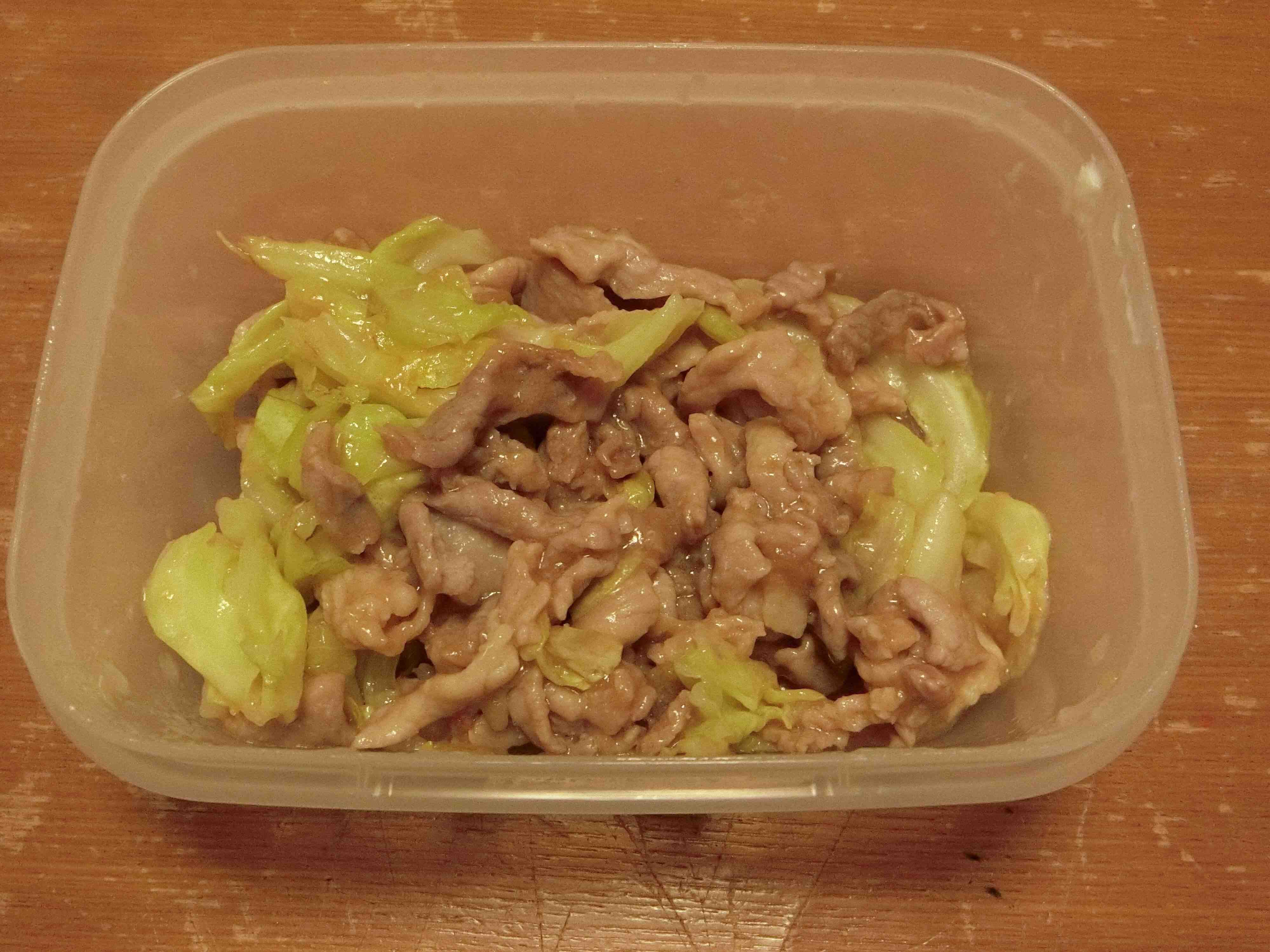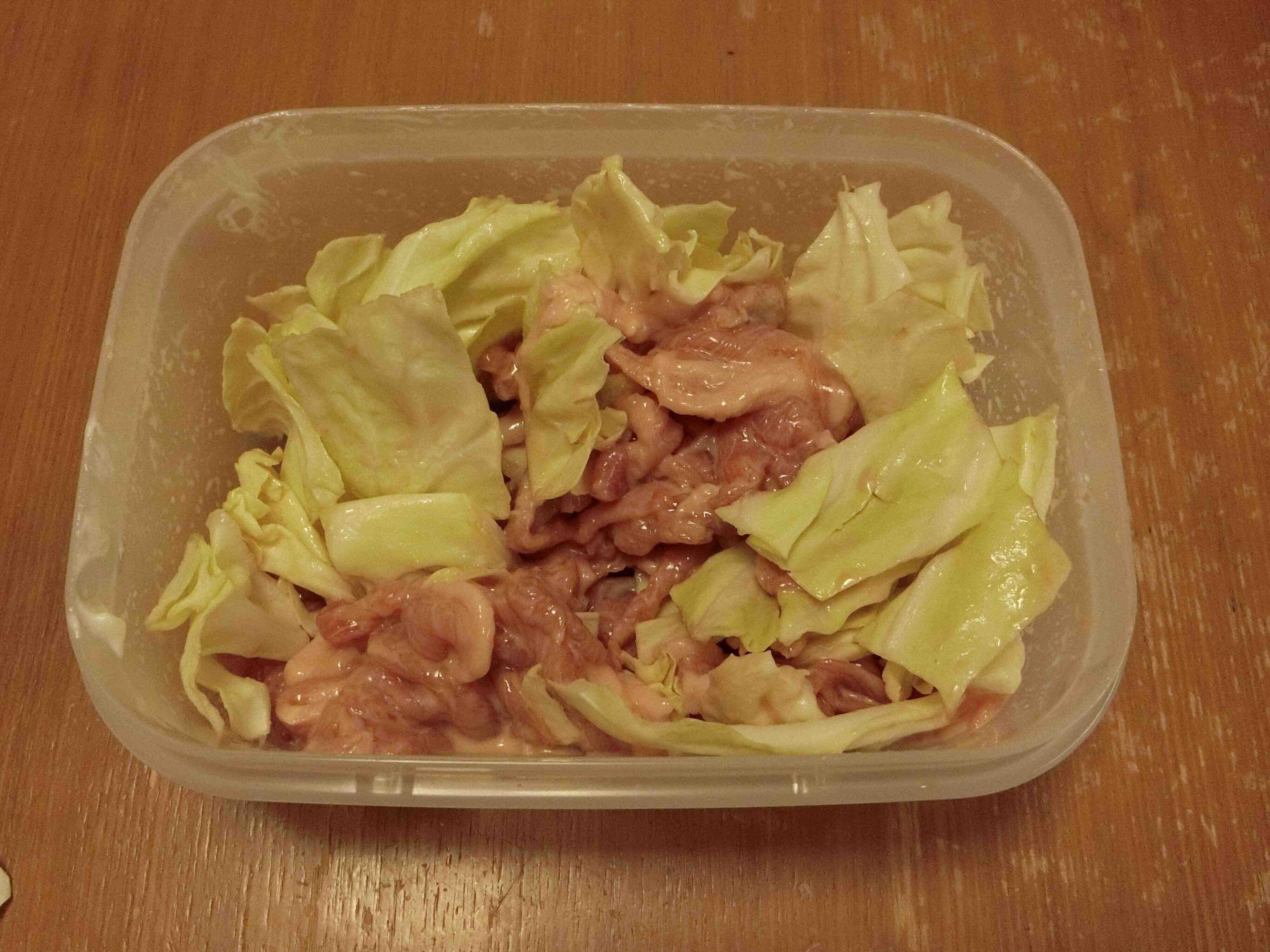 2.耐熱容器に豚こま肉としょう油、マヨネーズと片栗粉を入れて混ぜ合わせます。よく混ぜたらキャベツを入れてさらに混ぜます。