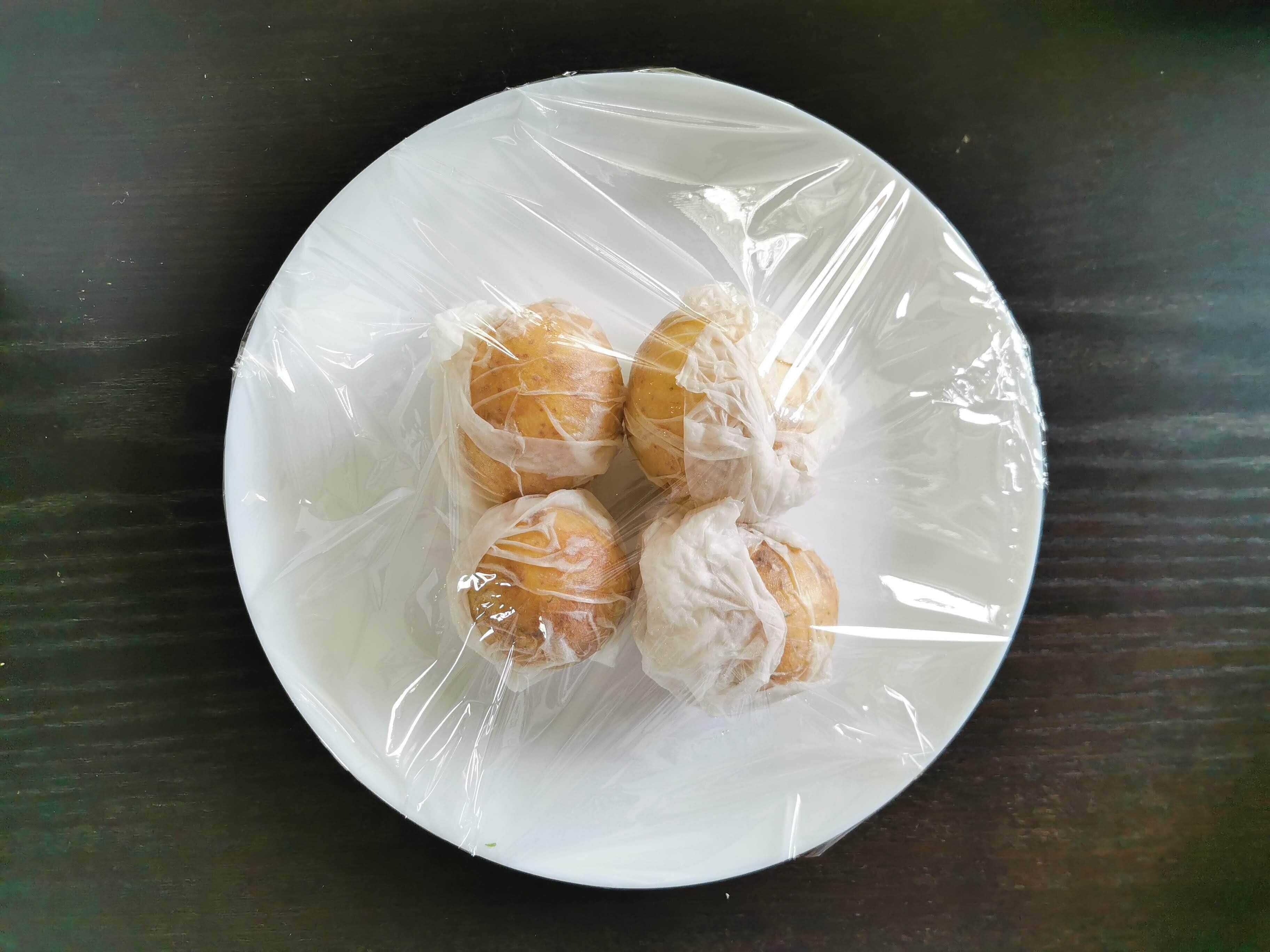 (1)じゃがいもを洗い、1個ずつ濡らしたペーパーで包む。