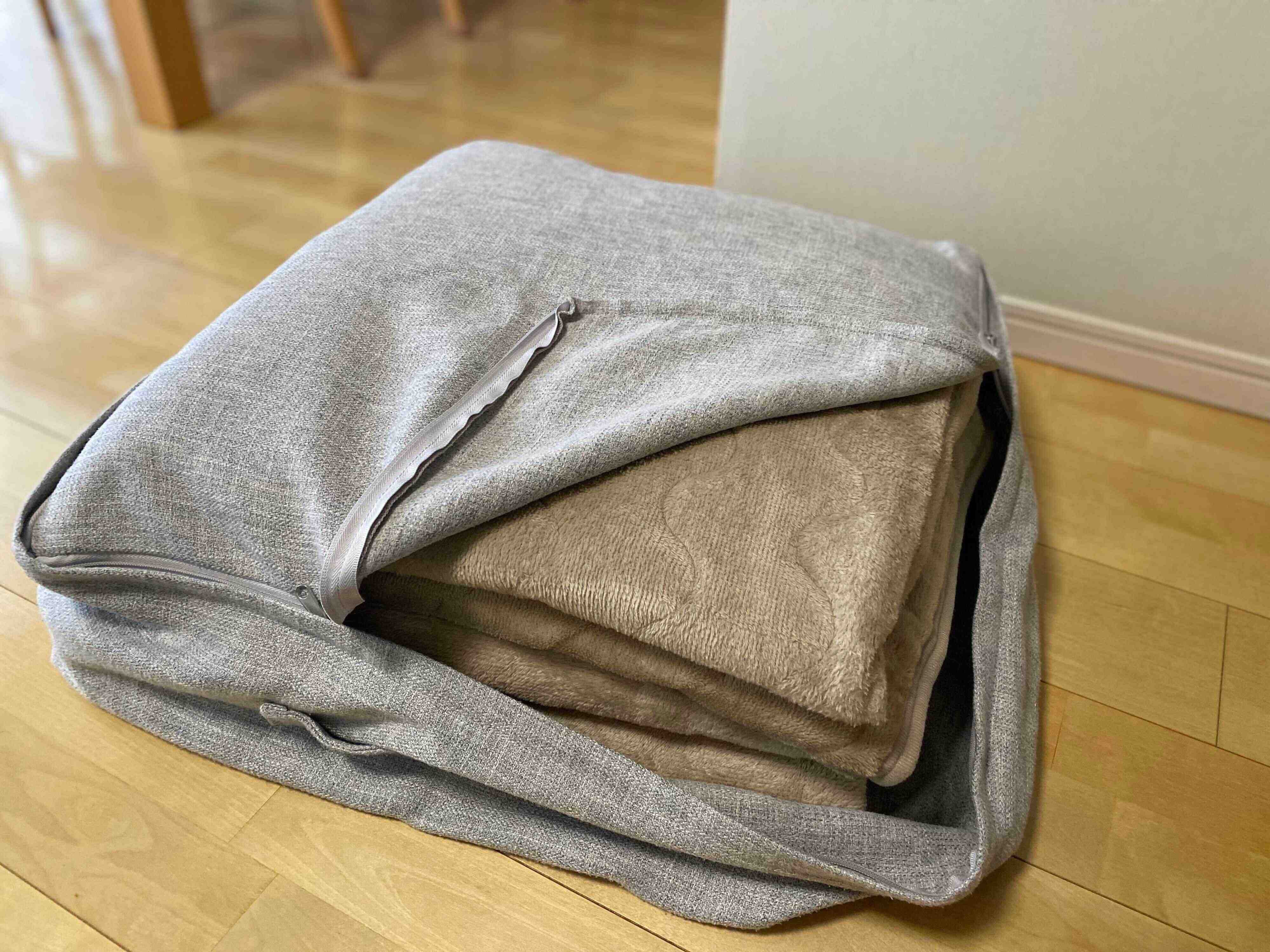 毛布や羽毛布団など、クッション化してしまえば収納スペース要らずです。