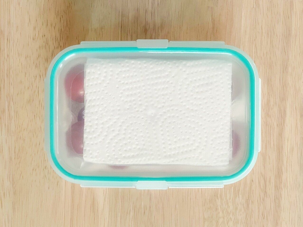 (4) 保存容器にキッチンペーパーを敷き、ミニトマトをいれる。