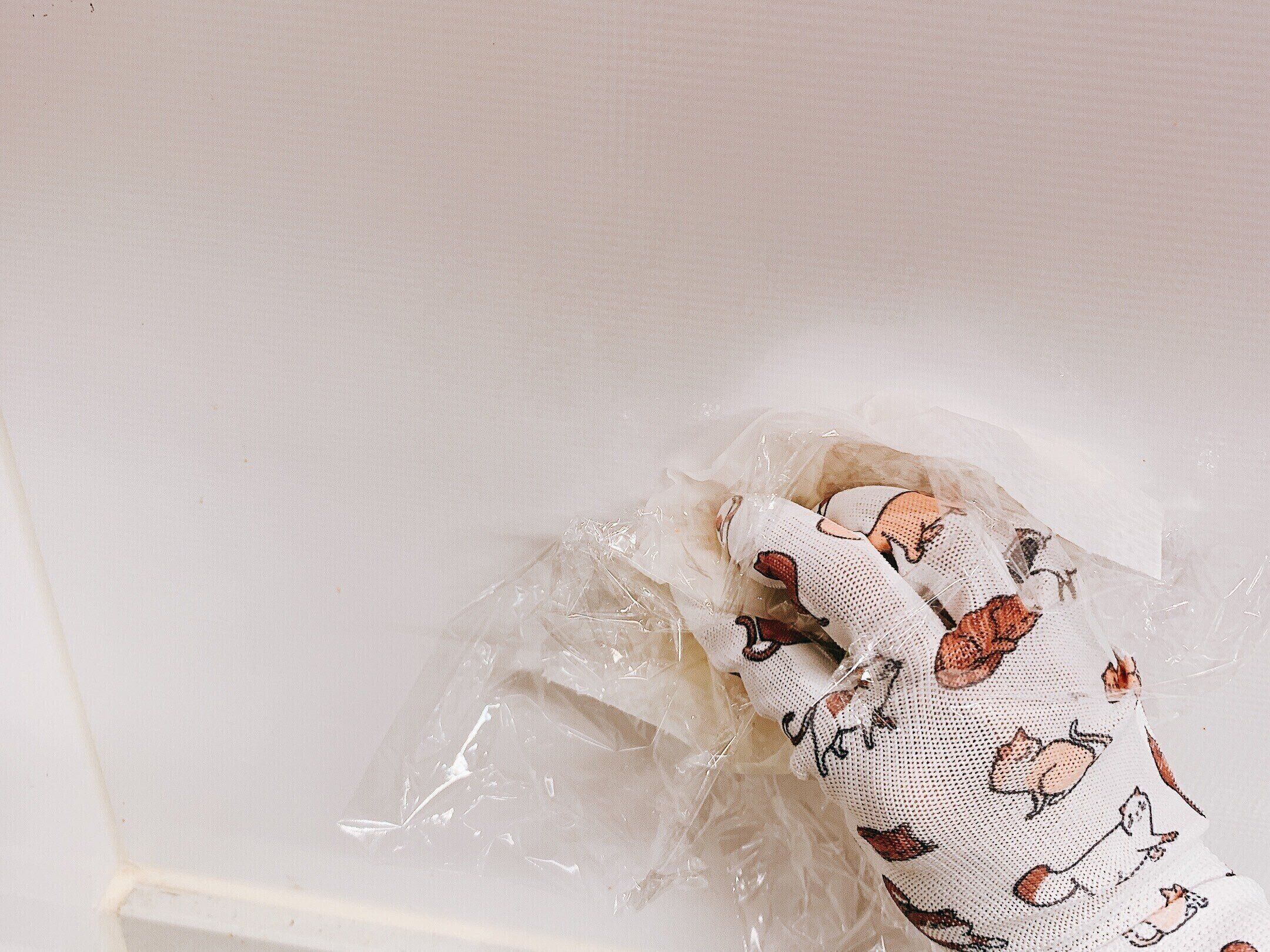 数分ドライヤーで温風をかけた後は、ラップとキッチンペーパーをはがします。はがす際は、油汚れをふき取りながらとっていきます。アルカリ電解水も熱を加えることでより油汚れに反応してくれます。