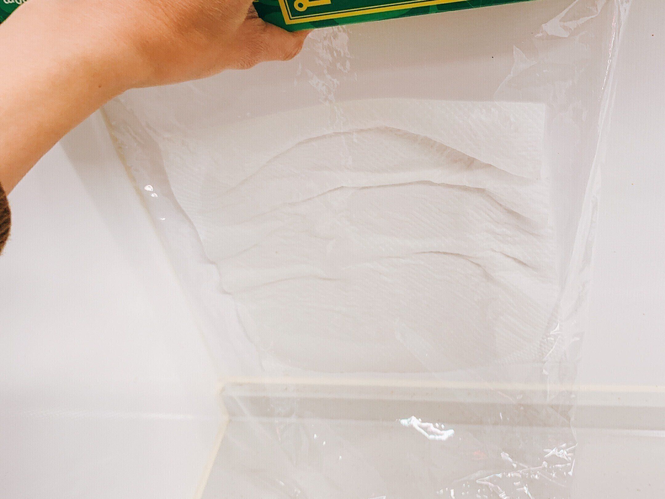 キッチンペーパーにかけたアルカリ電解水が蒸発するのを防ぐためにラップを覆いかぶせます。覆いかぶせると、湿ったキッチンペーパーにラップがくっつきます。その状態で準備完了です。